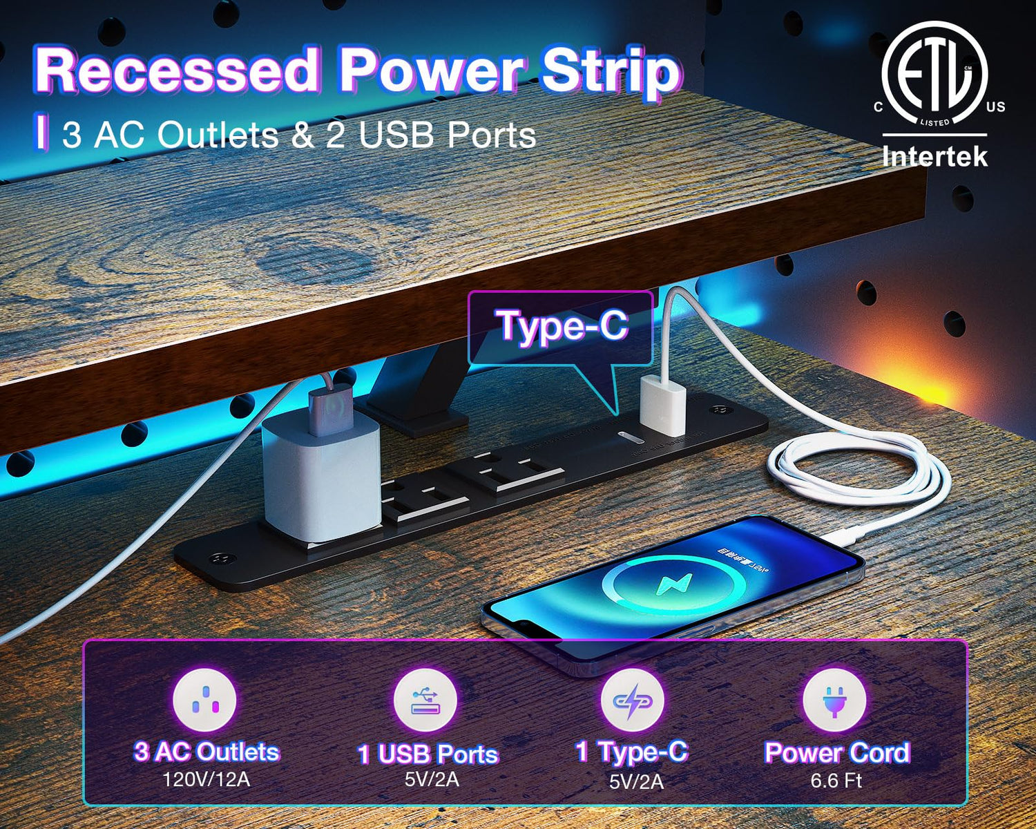 - **Power and Charging Convenience**: Equipped with 3 power outlets, a USB charging port, and a Type-C charging port, staying connected has never been easier. Charge your smartphone, gaming gear, or Bluetooth devices effortlessly while you work or play.