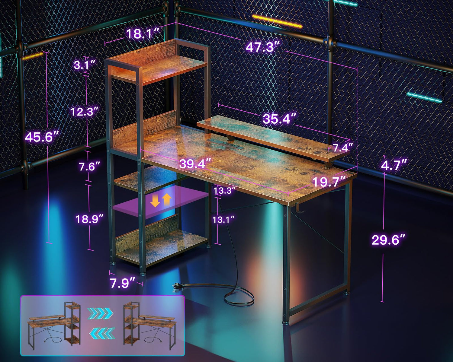 ODK 40-Inch Rustic Brown Small Computer Desk with Power Outlets, USB Charging Port, and Reversible Storage Shelves