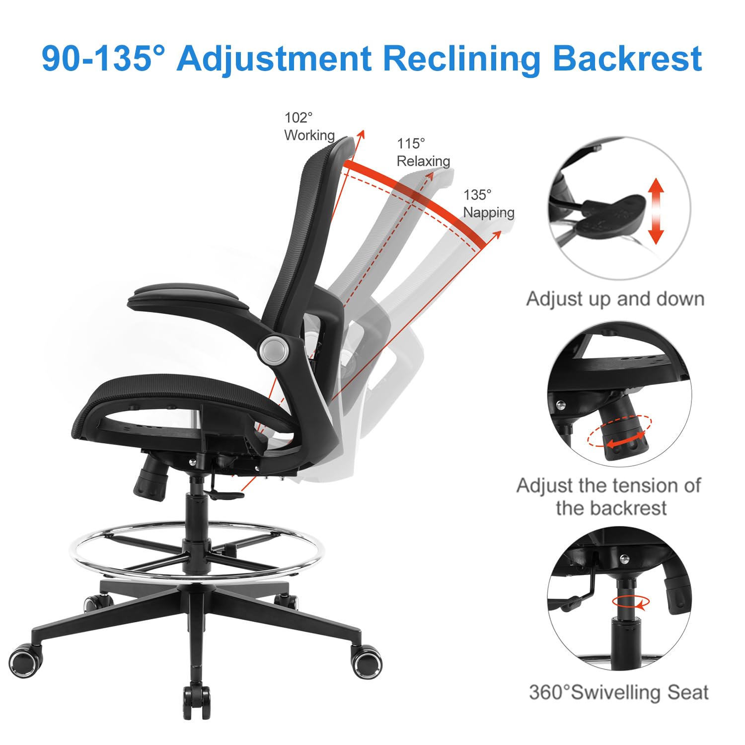 - 【Big and Tall Design】 Crafted for comfort, our ergonomic drafting chair is designed to accommodate individuals of all sizes. The premium breathable mesh back keeps you cool throughout the day, promoting efficient work and enhancing your productivity. The curved lumbar support aligns with the natural curvature of your spine, relieving pressure and helping you maintain proper posture. Even during extended periods of sitting, this chair provides incredible comfort and support.