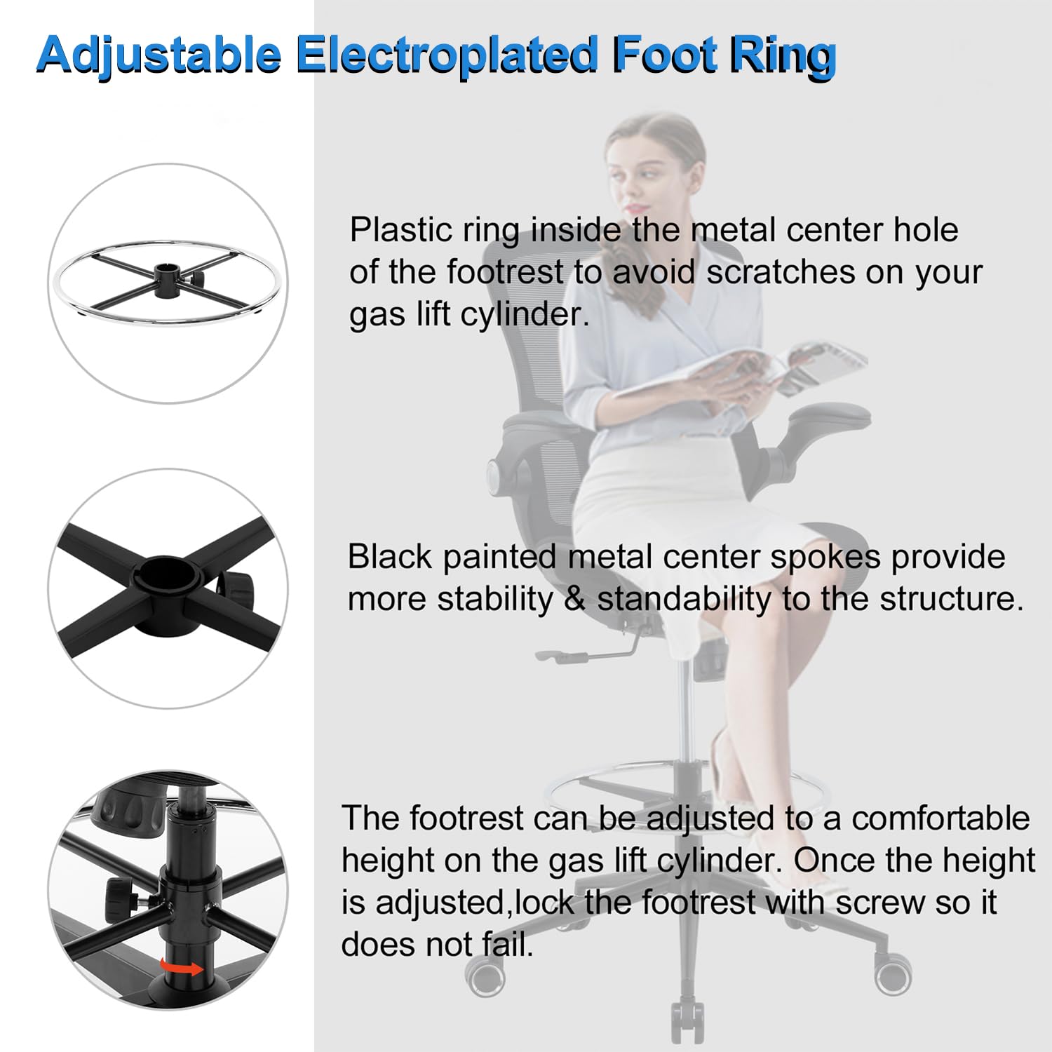 - 【Adjustable Electroplated Foot Ring】Height-adjustable chair with Electroplated Foot Ring. Ideal for tall desks and standing desks, the enlarged footrest ring reduces leg fatigue. Black painted metal spokes enhance stability. Seat height ranges from 23.62 to 31.1 inches, catering to your needs.