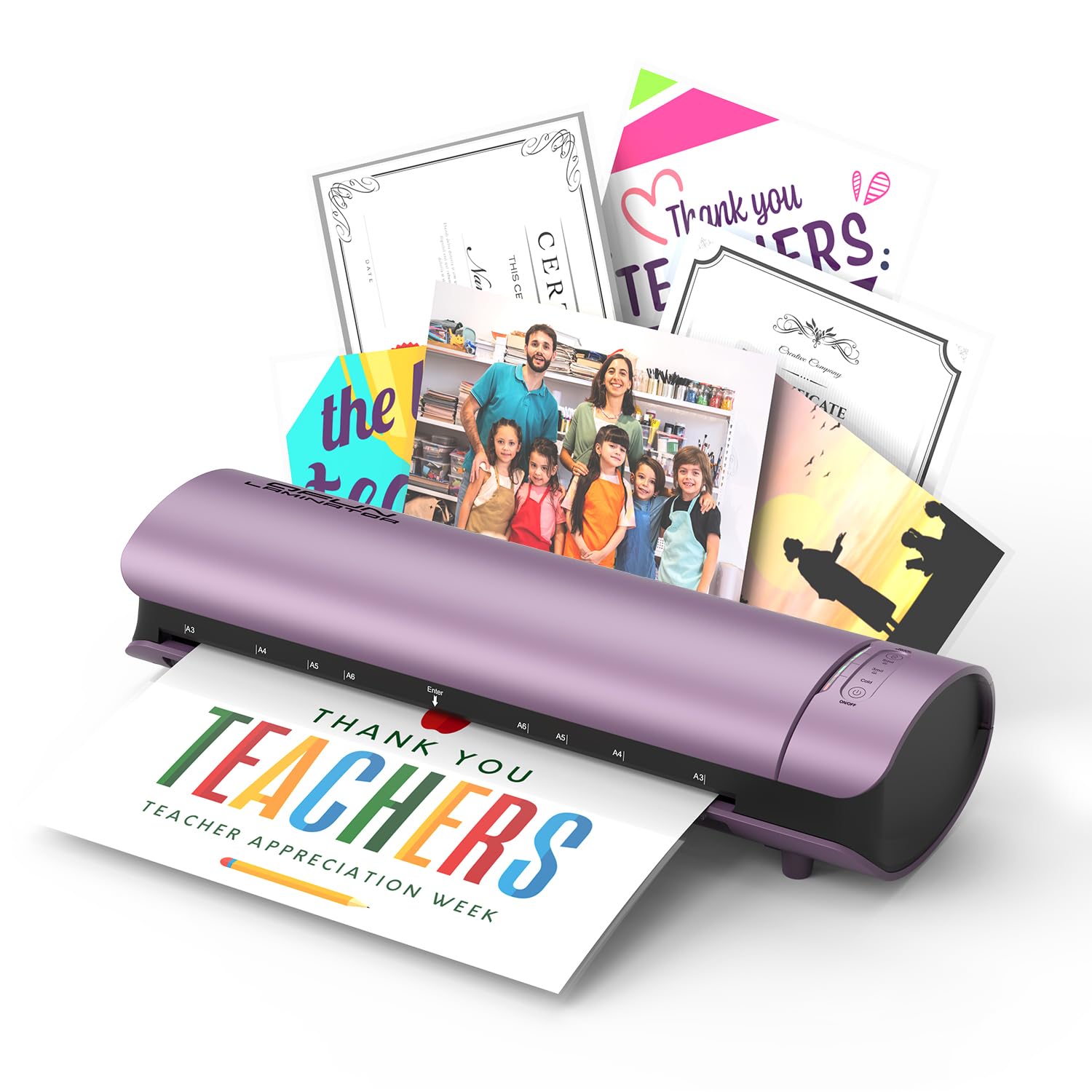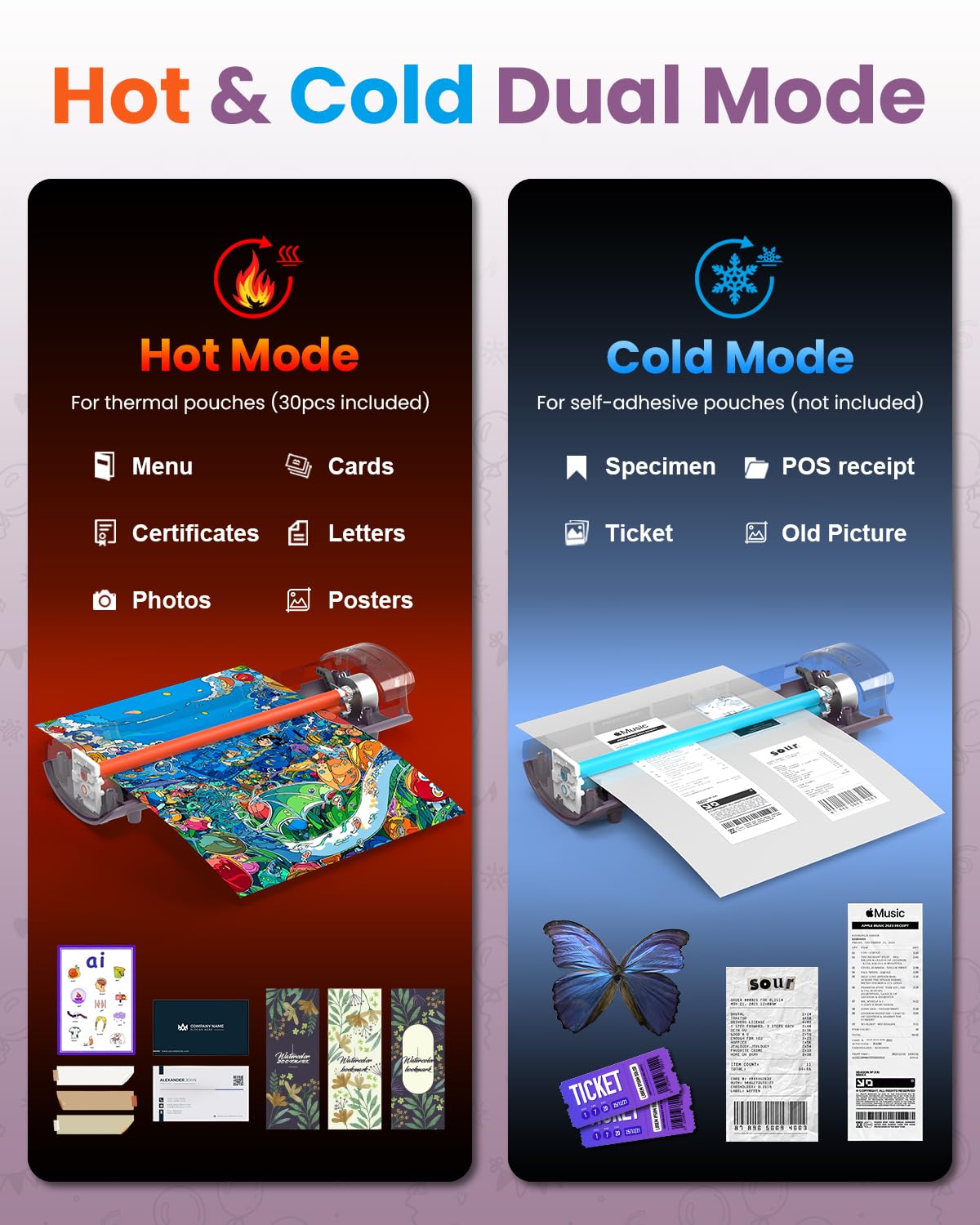 - Thermal/Cold Mode: Different from the plastificadora laminadora with only one mode, this laminator machine with laminating sheets can not only process 3/5mil of double layer pouch in thermal mode, laminate teaching materials, party signs, office documents, you can also use cold self-adhesive transparency films (not included) for heat-sensitive items such as specimens, receipts, old photos. An Ideal choice for teacher appreciation gifts.