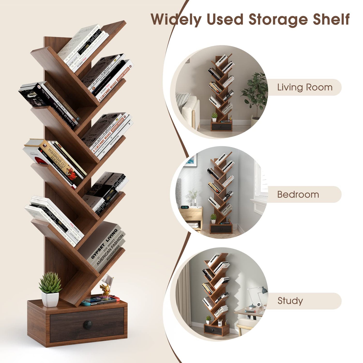OFFICEJOY 10-Tier Tree Bookshelf, Floor Standing Bookshelf with Drawer, Small Bookcase for CDs, Books, Magazines,Utility Organizer Shelves for Living Room, Study, Bedroom, Office, School, Brown