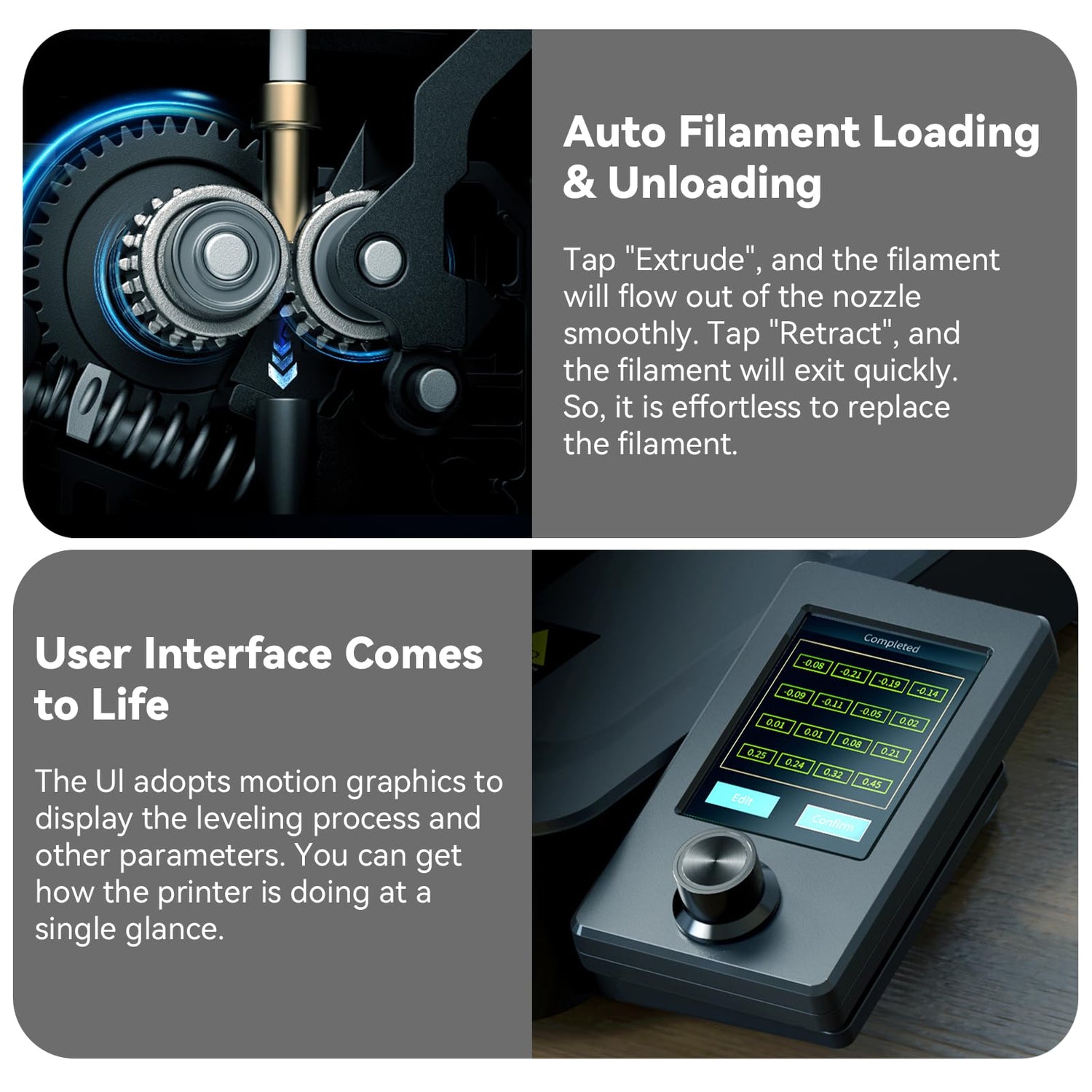- 【Fast and Efficient Printing】The Ender 3 V3 SE can print at speeds of up to 250mm/s with an acceleration of 2500mm/s², allowing for rapid model completion. The user-friendly UI includes motion graphics for convenient monitoring of the leveling process and key parameters, offering an instant snapshot of the printer's status.