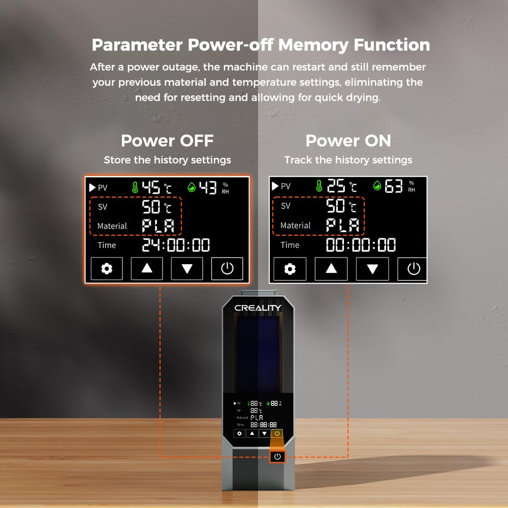 - [Parameter Power-off Memory Function] After a power outage, the machine can restart and still rememberyour previous material and temperature settings, eliminating theneed for resetting and allowing for quick drying