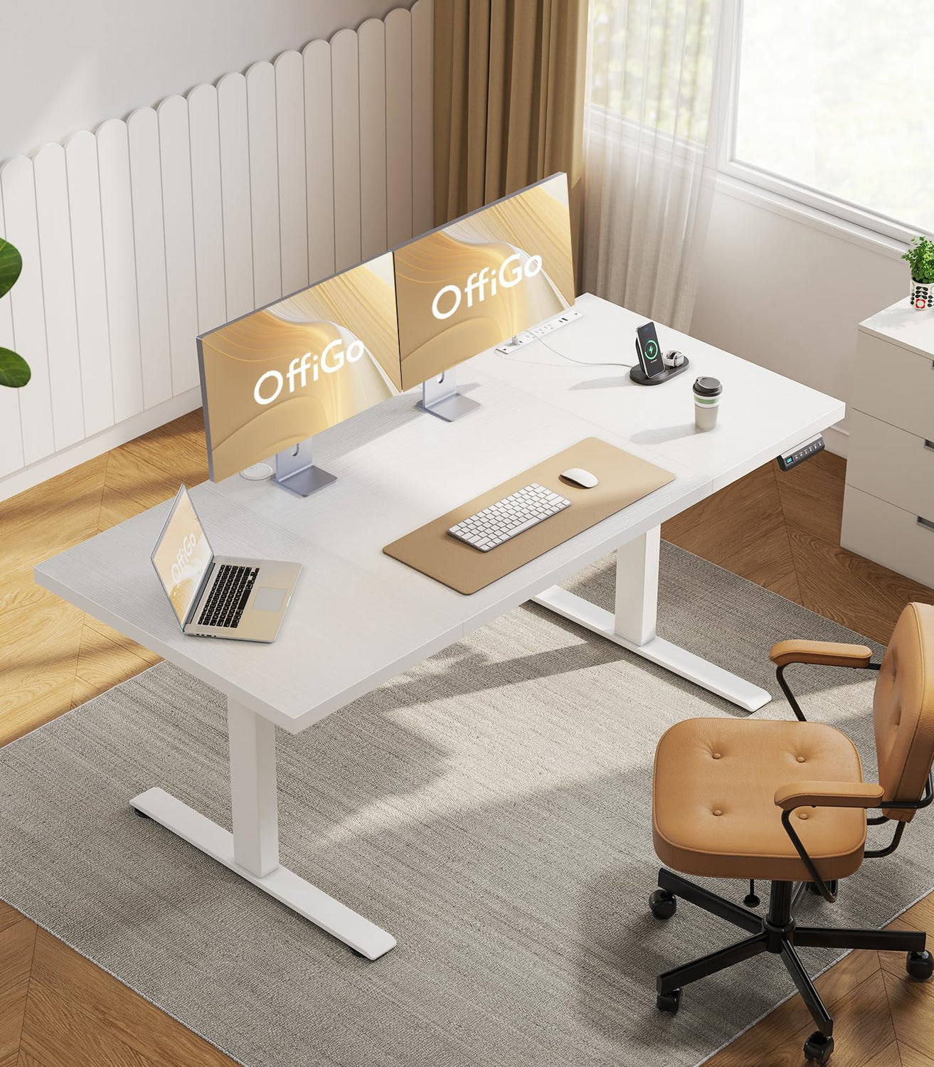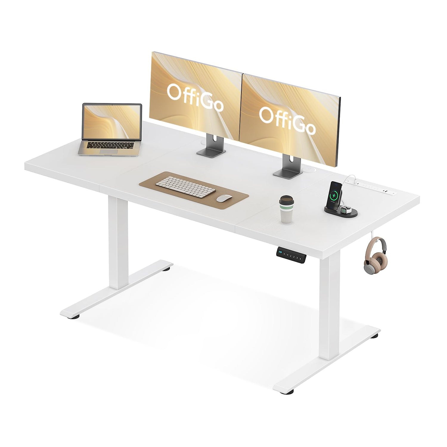 OffiGo Electric Standing Desk with 3-Piece Board, 71 Inch Height Adjustable Large Table with Power Outlets, Sit Stand Table, Writing Computer Desk for Home, Office, Workstation, White