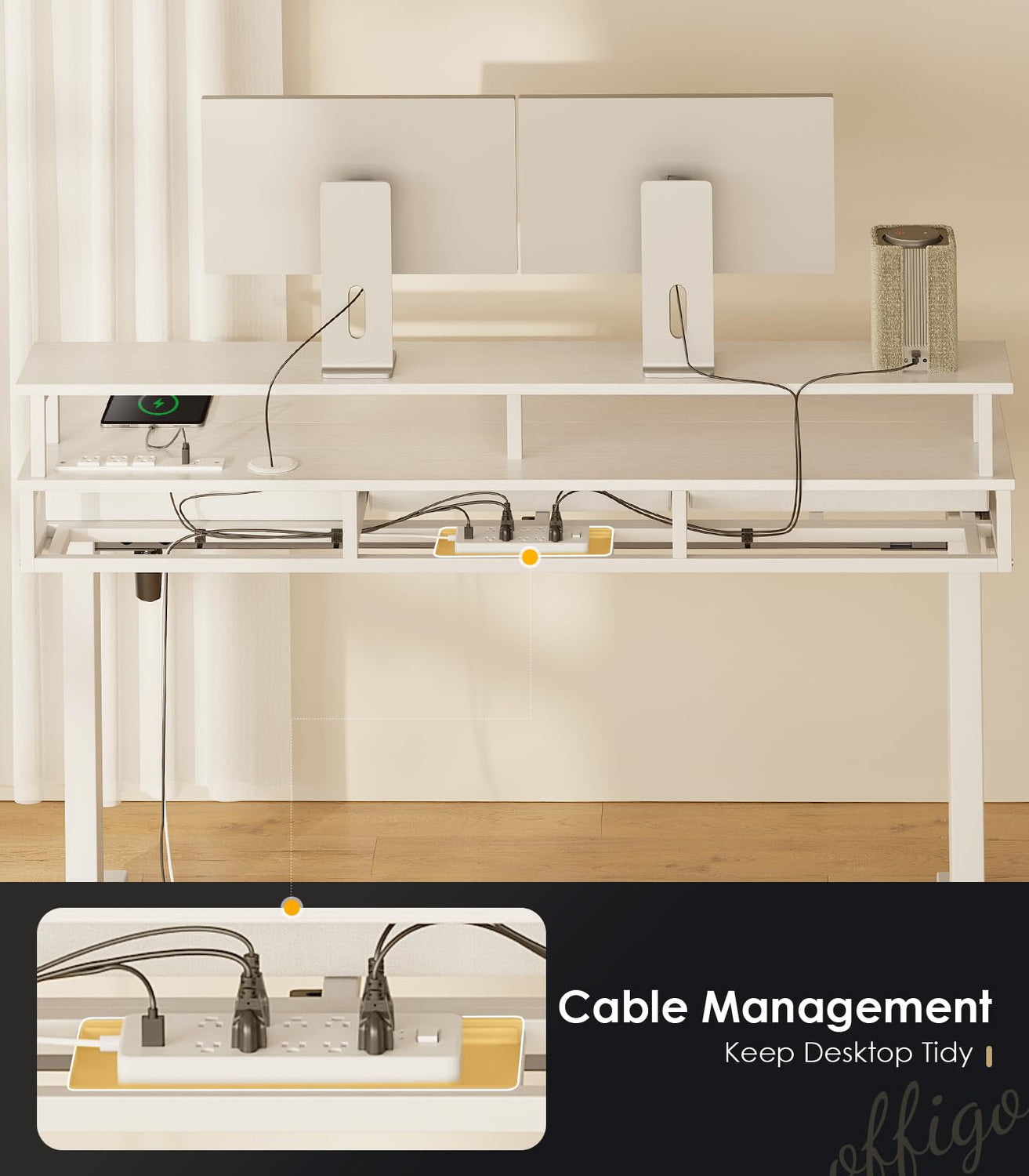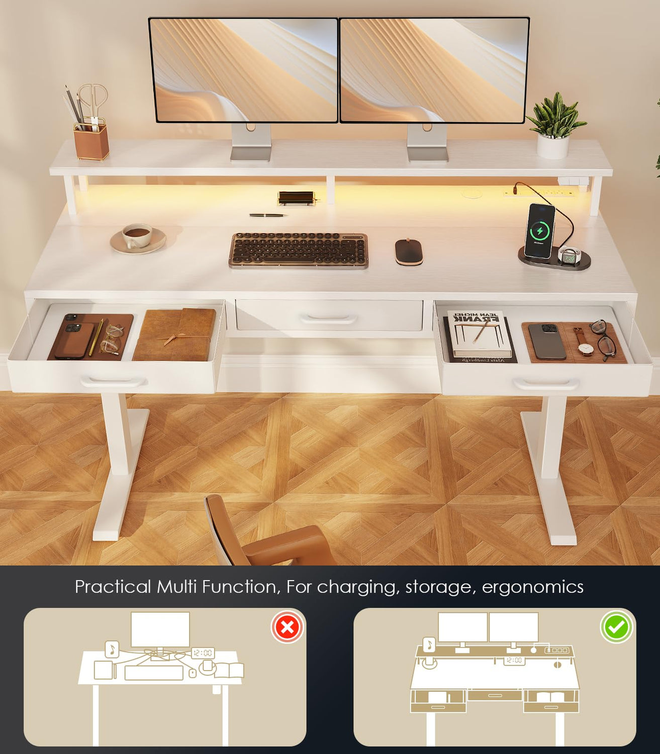 OffiGo Electric Standing Desk with Drawers, 55 Inch Height Adjustable Desk with Power Outlets & LED Lights, Sit Stand Table with Monitor Stand for Home, Office, Workstation, White