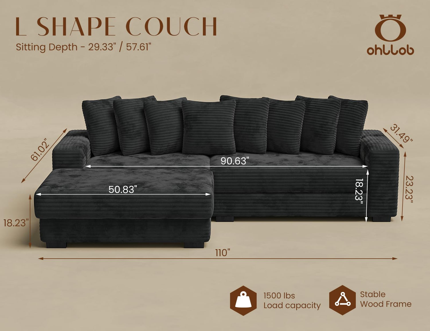 ohllob 110" Modular Sectional Sofa, L Shaped Couch with Chaise Lounge, Fluffy Corduroy Cloud Couch with Deep Seat for Living Room (Black)