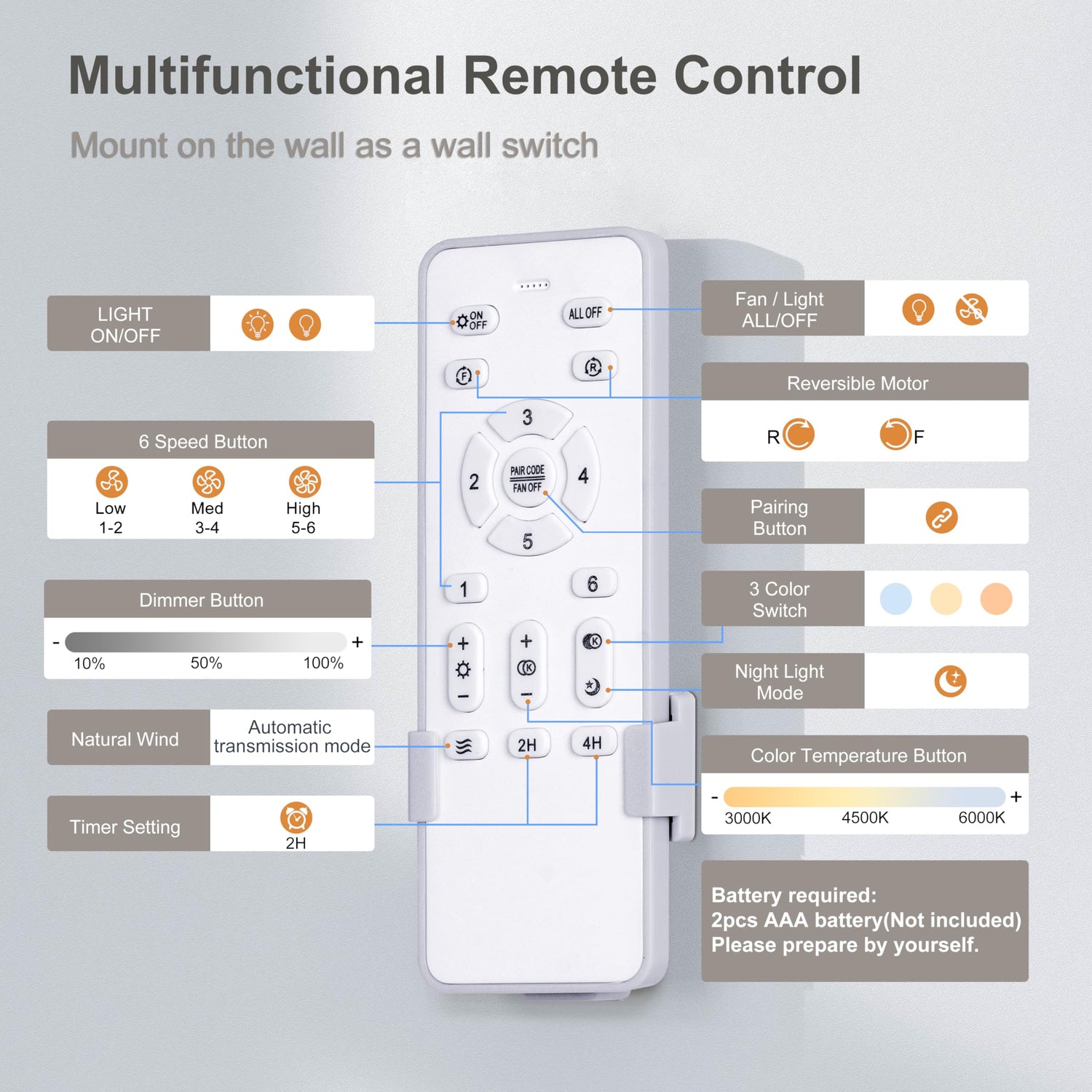 • Whispers Running: This 38-inch 6-speed DC motor bedroom ceiling fan is silent and energy-saving, and the night light and timing function is very suitable for use while sleeping