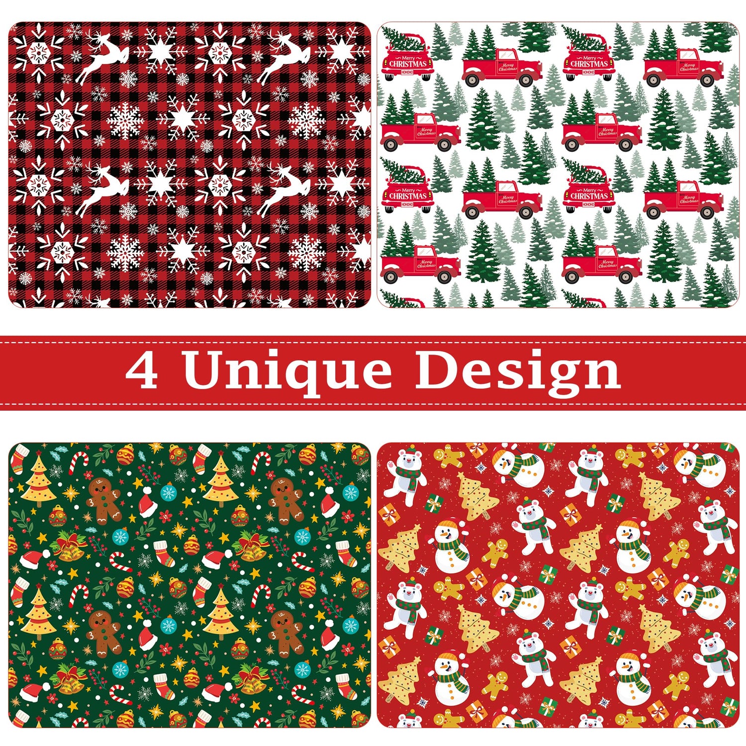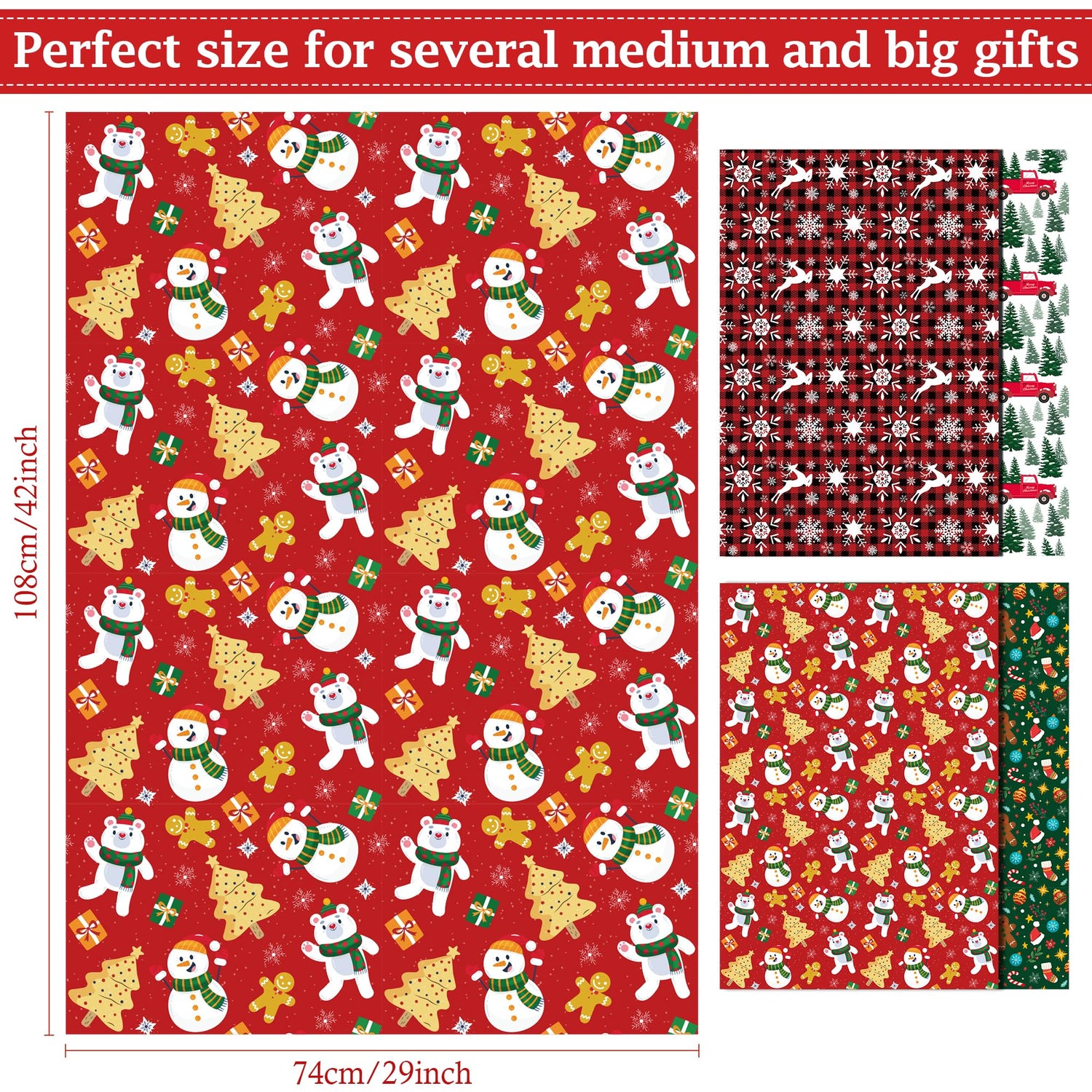 - Make Your Gifts Stand Out: Our Christmas wrapping paper sets include 4 sheets with vibrant, festive designs featuring Christmas trees, Santa Claus, snowflakes, and more. Each 29x42 inch sheet is perfect for wrapping several big and medium gifts, effortlessly adding holiday cheer!