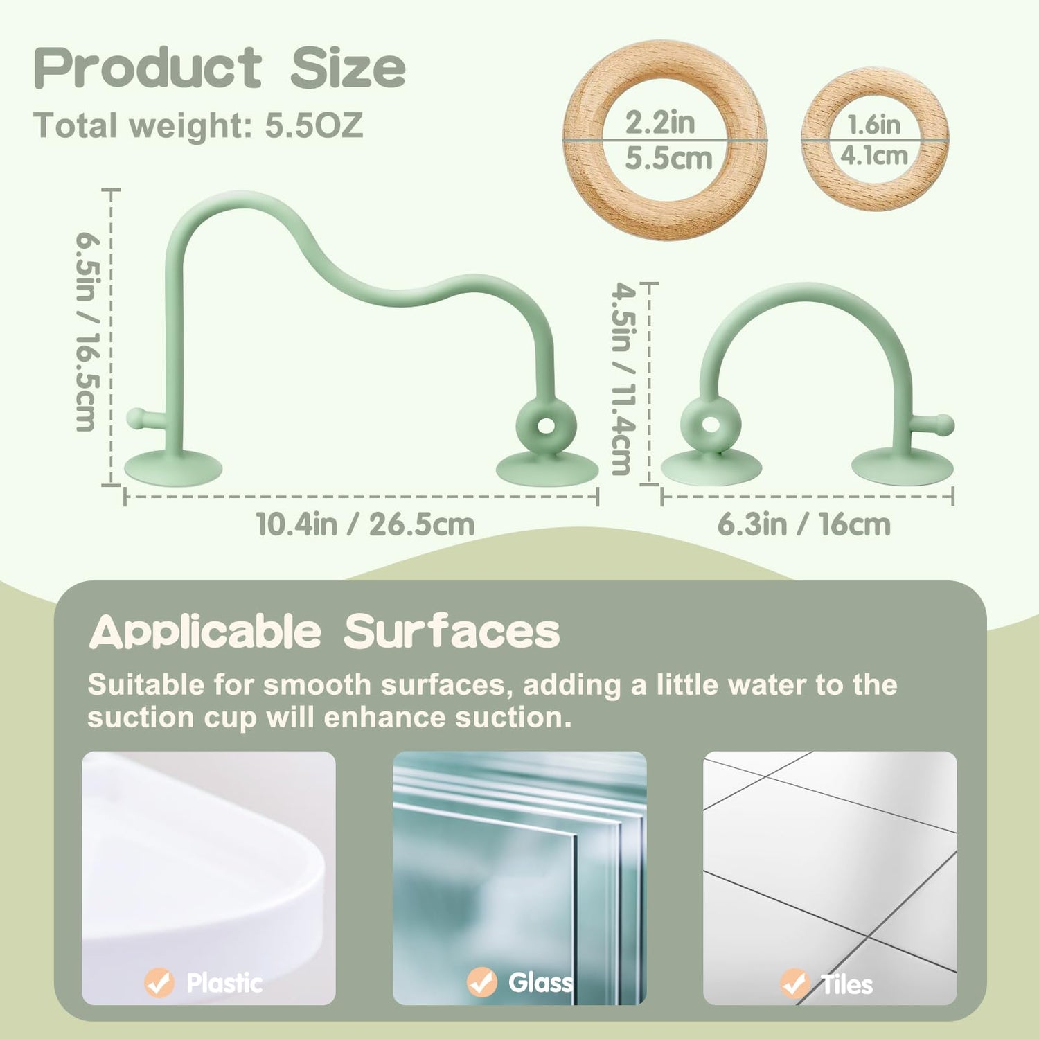 - 【High Quality, Safe, Non-Toxic】Safety is the first priority for baby toys. Our high chair toys have been rigorously tested and and has passed ASTM & CPC certification, complying with child safety standards. This teething toy is made of non-toxic food-grade silicone, BPA-free, gentle and non-irritating to baby's skin; the wooden loops are made of high-quality oak, smooth and without burrs, making baby's teething relief and play safer and more comfortable.