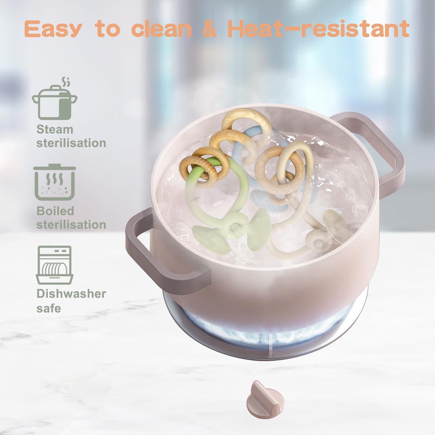 - 【Easy to Clean and Maintain】This teethers for babies 3-6 months is dishwasher friendly, very simple to clean and maintain! The silicone part of the toy can be sterilised by boiling water at high temperature, or steam and UV. The wooden loops can be rinsed clean with water or wiped with a damp cloth after use, making cleaning convenient and burden free, ensuring safety and hygiene for baby's every playtime.