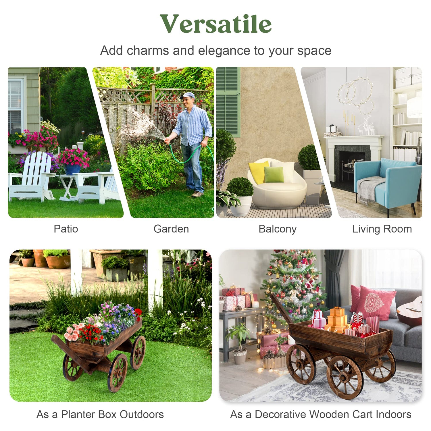 Details: Our wagon use the wheels were reinforced with metal,It's stronger. It won't fall apart.【Easy to Move】: This planting cart has an adjustable long handle, making it easy for people of different heights to use. In addition, there are 4 flexible wheels to help you move easily indoors and outdoors.【Durable】: Made of high-quality cedar and burned-treated, this seeder cart has high weather resistance. Natural and sustainable materials perfectly match the style of your garden or courtyard, with iron-reinforced wheel hubs for long-term use.【Product】: Garden Cart Wooden Charcoal Pushcart, The product's width and length can safely accommodate your plants. It provides you with enough space to plant different flowers or plants. It perfectly protects the root of the flower, allowing it to grow healthily.【Assembly】: Includes all accessories and instructions to help you assemble better and protect your hands. The overall product size is 44.88 * 18.11 * 24.01 inches.【Promise】: If you are not satisfied with the product you purchased from us, please contact us, we will provide you with satisfactory solutions. If you encounter any problem while assembling the flower pot, you can contact us anytime.