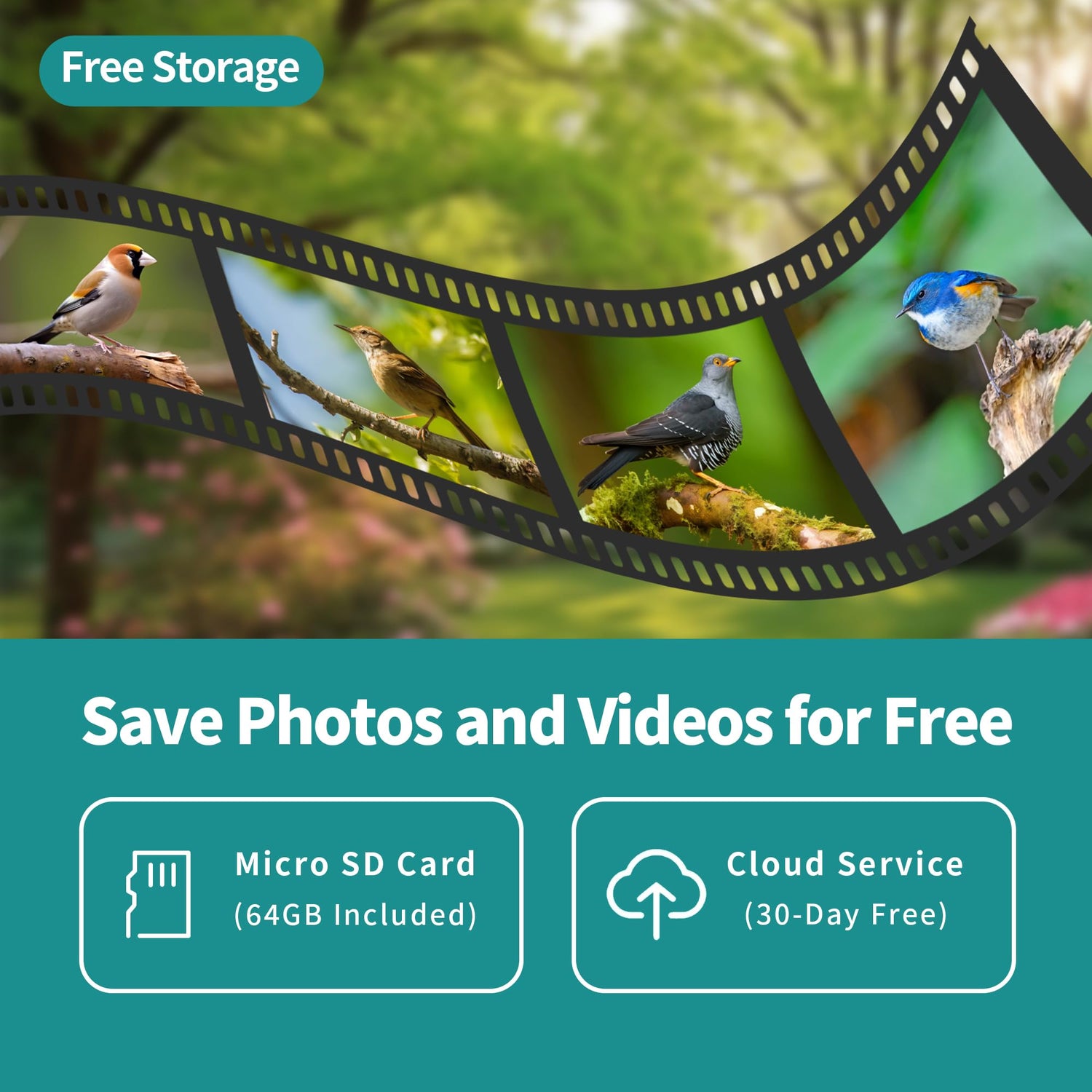 - 【Free storage&Gifts for bird enthusiasts】The OIRHNL bird intelligent feeder with a camera can store recorded bird videos in cloud storage for up to 3 days. In addition, you can subscribe to extensions or store them on a free 64G card. You can fully enjoy the fun of bird watching without worrying about storage issues. What is more, with a 5dBi antenna, the camera supports more stable 2.4GHz Wi Fi connection, so you will never worry about losing signals and missing a moment of bird visitors.