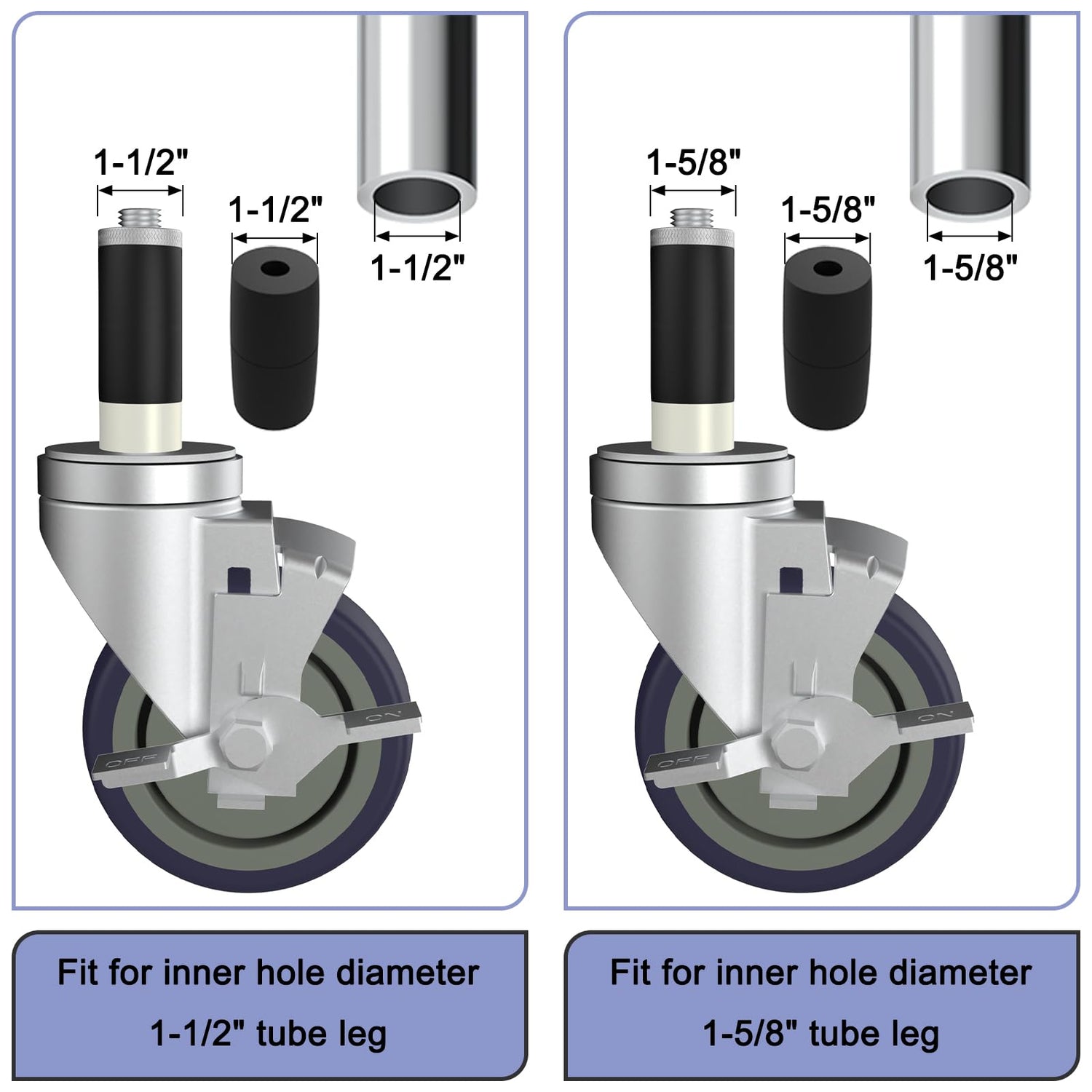 - Easy To Install Stainless Steel Table Casters: Table wheels set of 4 is adjustable.Comes with two rubber sleeves of different sizes(1-1/2" and 1-5/8").Fitting 1-1/2" to1-5/8" diameter prep table legs,just take off the 1-1/2" rubber sleeves before use the 1-5/8" rubber sleeves