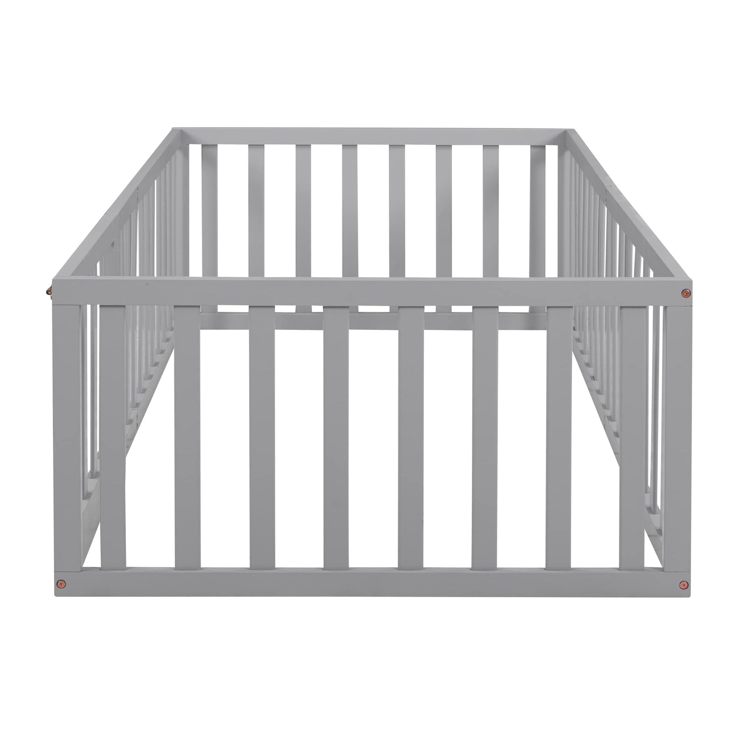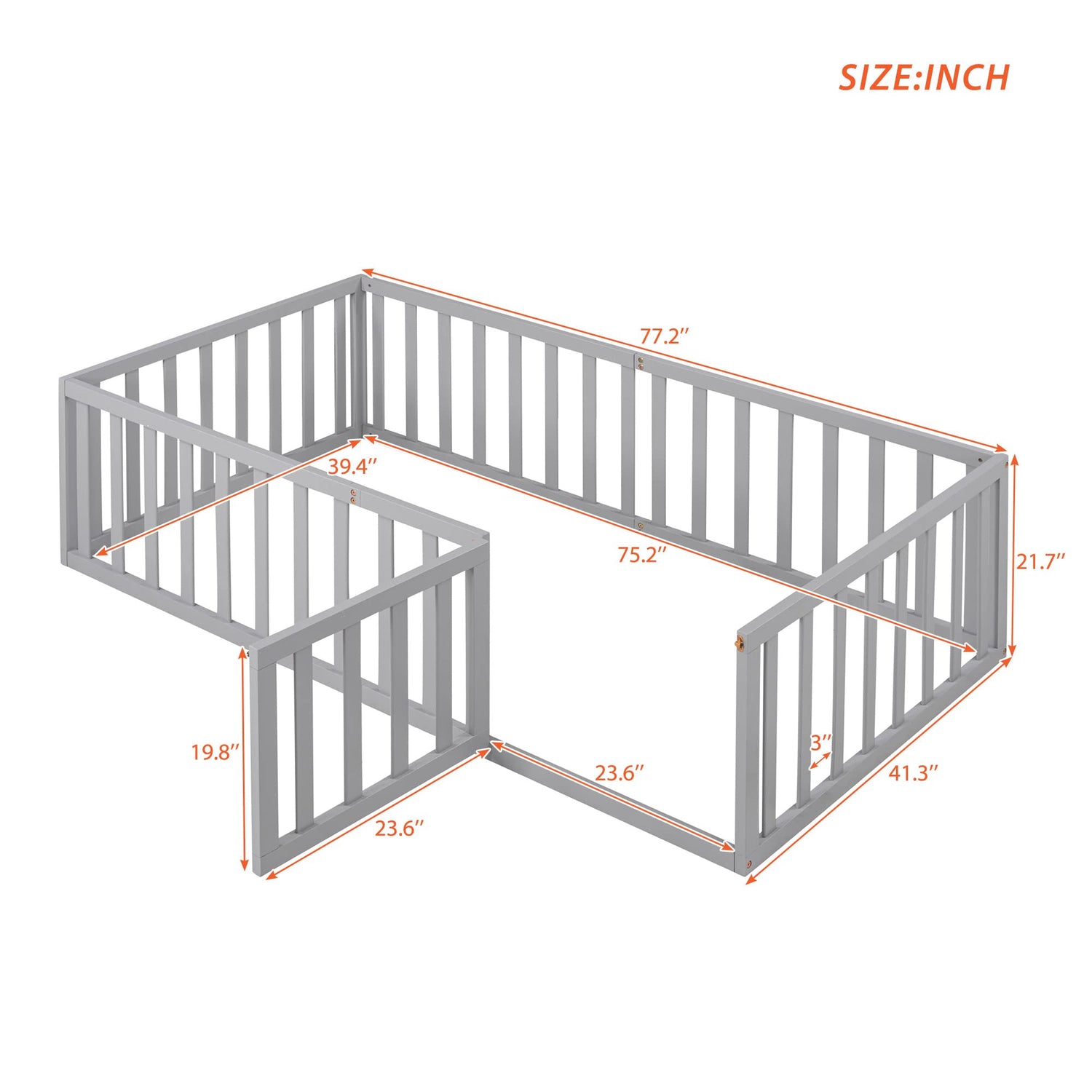 Okak Twin Size Montessori Floor Bed with Safety Guardrails and Playful Door, Light Gray