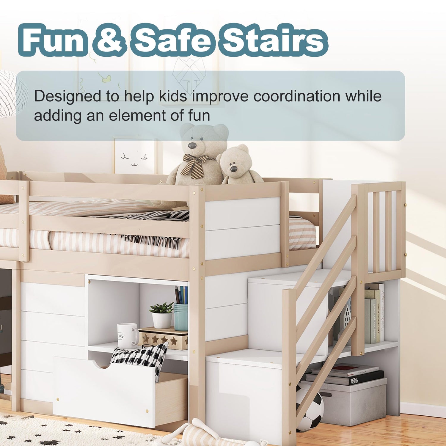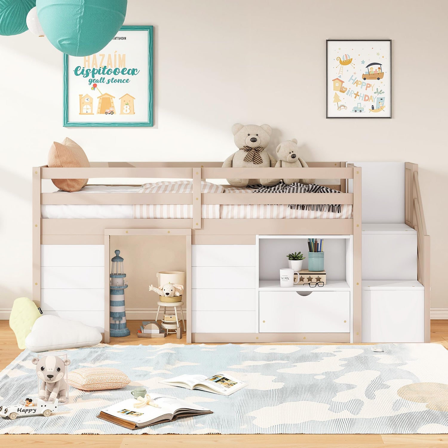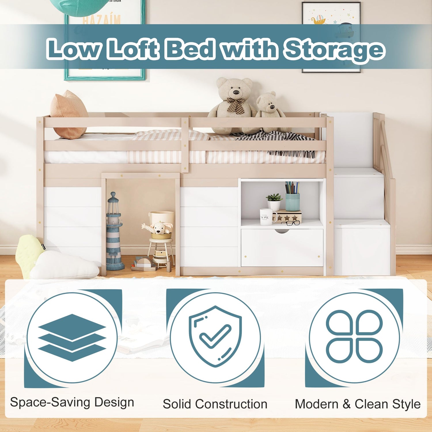 Okak Twin Size Low Loft Bed, Kids Loft Bed Frame with Playhouse, Drawer, Shelf, Stairs for Storage, Toddler Beds Frame with Safety Guardrail and Strong Wood Slats for Girls or Boys - White & Cream
