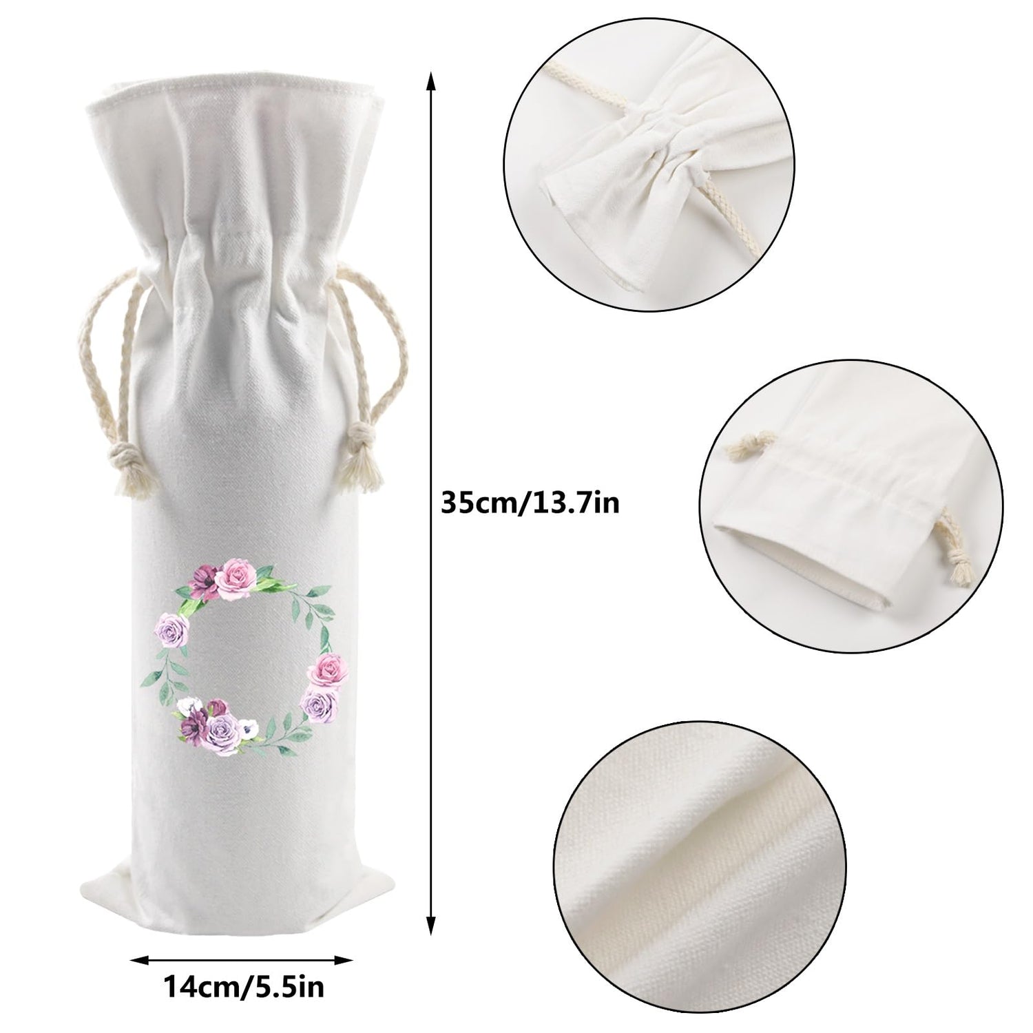Details: 10 PCS sublimation blank wine bags with drawstring, approximately 5.5 x 13.7 inches / 14 x 35 cm, suitable for regular 750 ml bottles, such as champagne bottles; Please check the size of the bottle before purchasing.Thermal sublimation printing: 210 degrees Celsius, 20 seconds, pressure medium pressure
