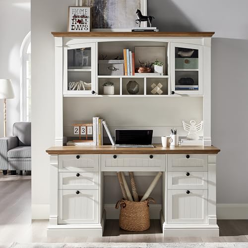 - Exceptional Storage Capacity: The upper hutch features two glass-front cabinets, open cubbies, and display shelves—ideal for organizing books, décor, or office supplies. Below, the desk offers a file drawer for letter-size documents, three utility drawers, and a concealed cabinet with an adjustable shelf to keep everything neat and within reach.