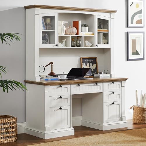 OKD 60" Executive Desk with Hutch and Drawers, Farmhouse Home Office Desk with Charging Station, Keyboard Tray, File Cabinet Storage, Wood Computer Desk for Work and Study, Antique White