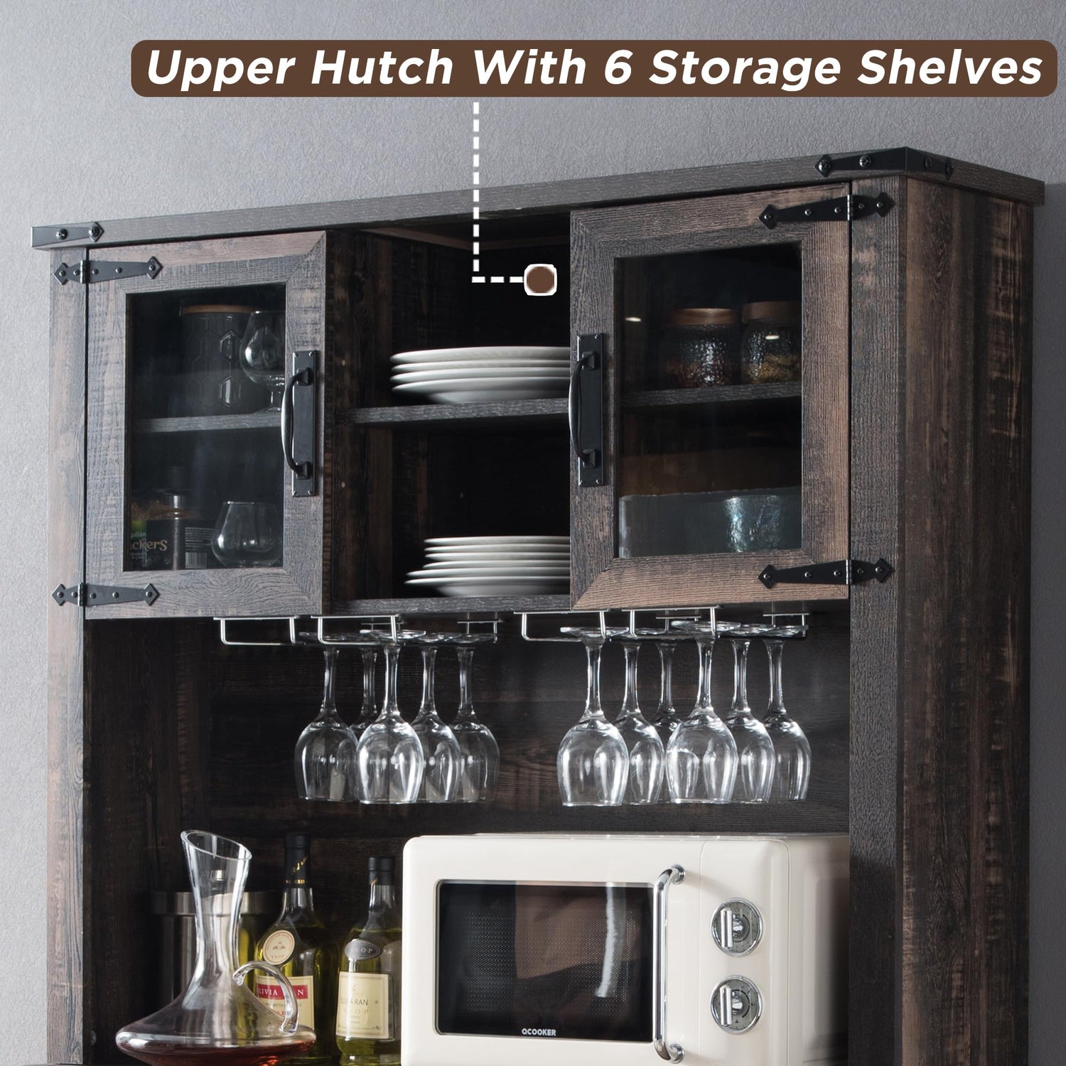 - Ample Storage Space: This kitchen cabinet composed of a buffet and upper hutch. The upper hutch has 2 open shelves and 4 shelves with glass door to provide large storage space while helping you find items easily. The bottom buffet has 6 shelves and 3 drawers allow you to classify kitchen utensils, jars, snacks, liquor orderly. The wide countertop is perfect to store microwave, coffee maker or whiskey. Each cabinet has adjustable shelves for flexible storage.