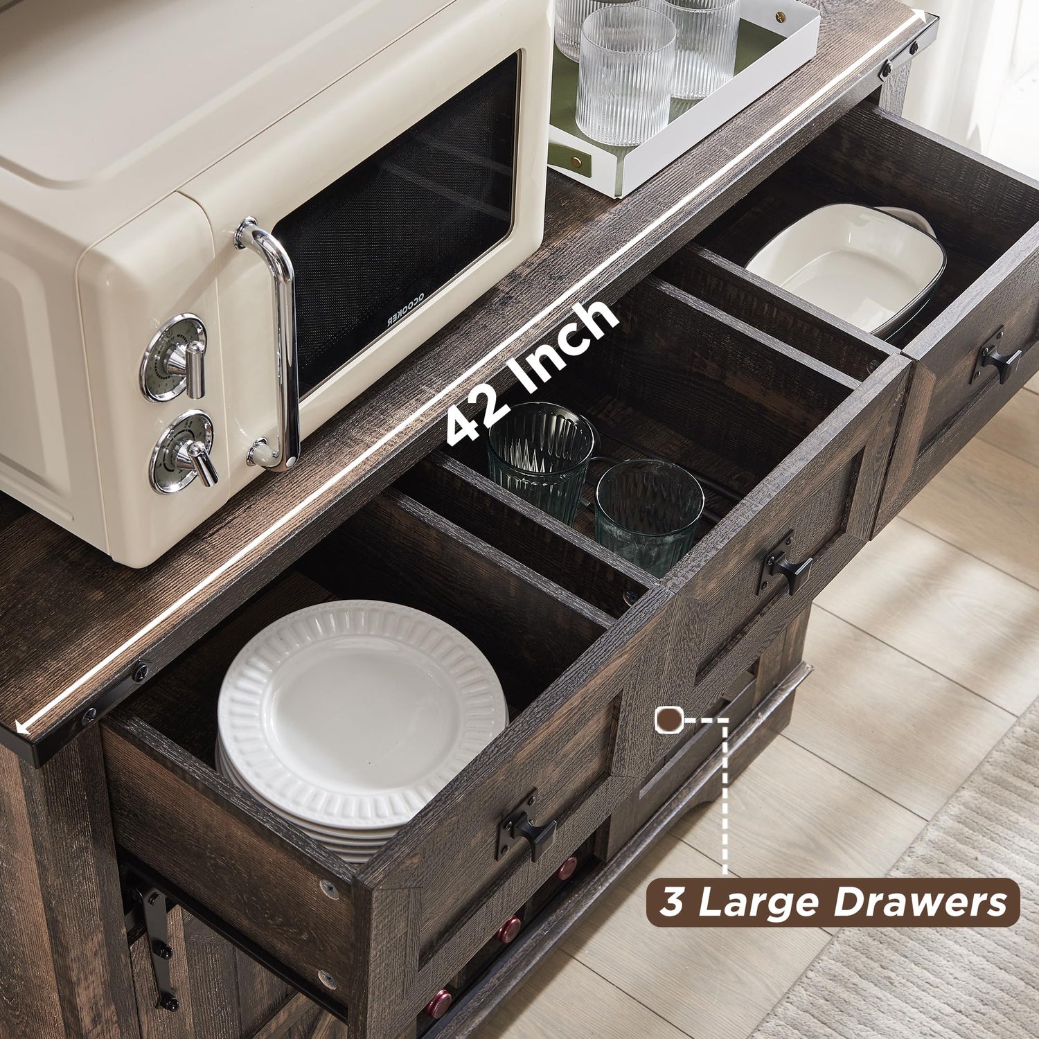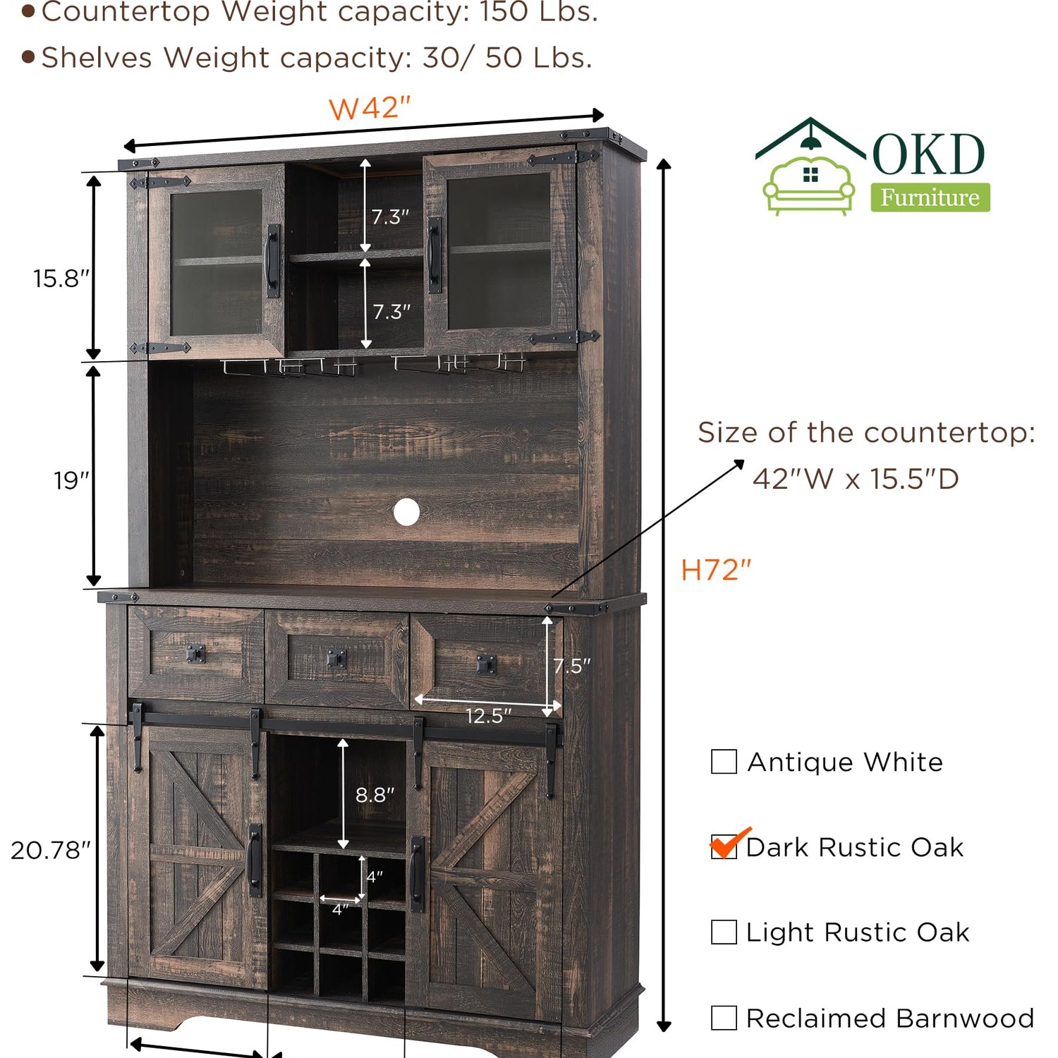 OKD 72" Farmhosue Bar Cabinet with Sliding Barn Door, Large Kitchen Buffet with Hutch w/Wine & Glasses Rack, 3 Drawers, 12 Storage Shelves, Rustic Coffee Bar Sideboard Table, Dark Rustic Oak