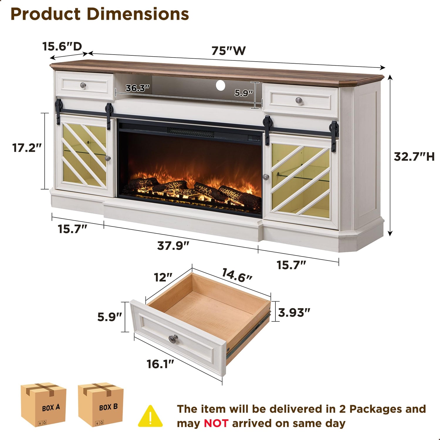 - Farmhouse Fireplace TV Stand: Measuring 75" W x 15.5" D x 32.7" H, this stylish and functional TV stand can accommodate TVs up to 85". The included LED fireplace can be used with or without heat and features 7 different color light options.. Featuring a striking replicated oak finish and robust plank design, it adds a touch of rustic charm to your home. With ample storage space, it enhances your room’s cozy and welcoming atmosphere.