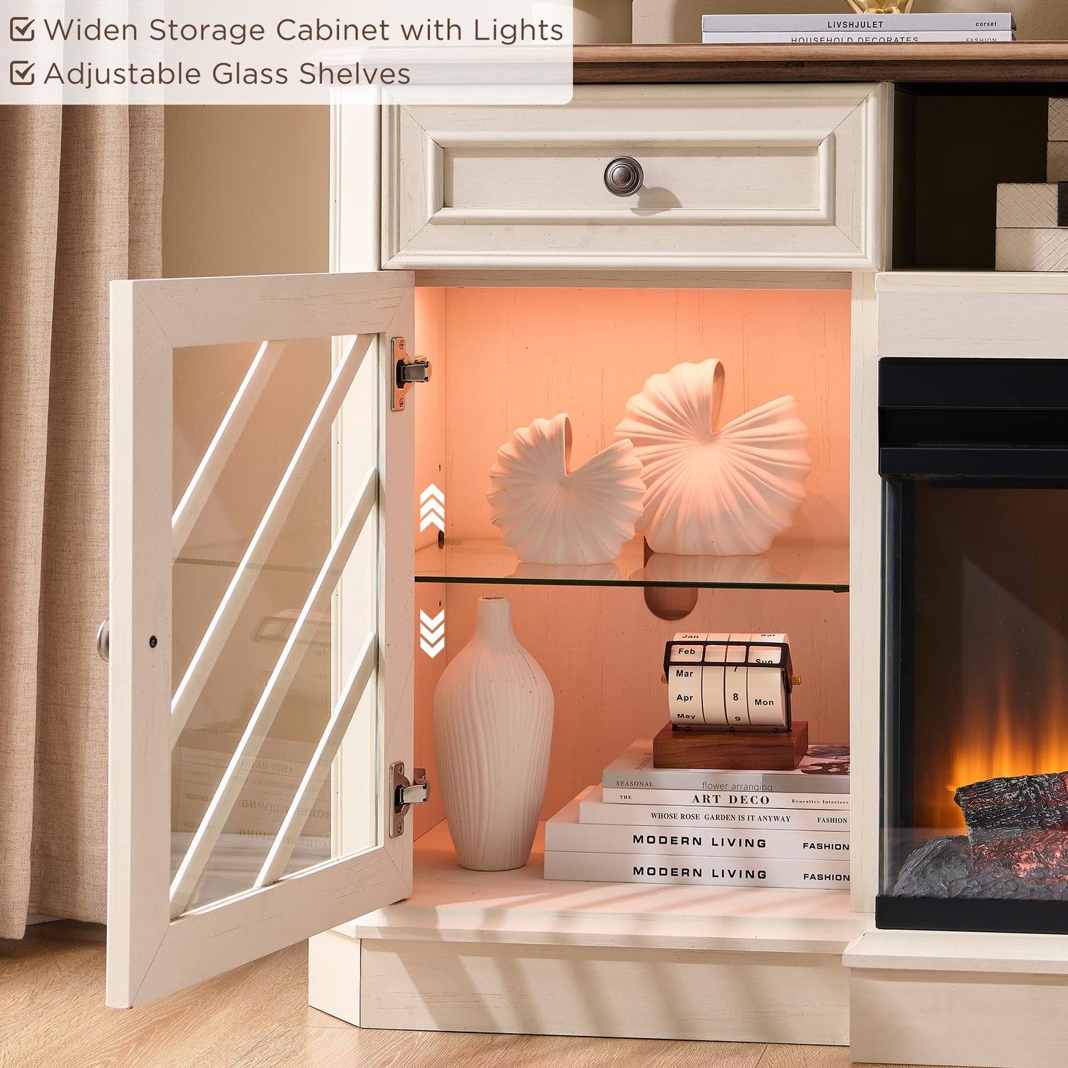 OKD 75 Inch 3-Sided Electric Fireplace TV Stand for TVs up to 85'',Modern Highboy Entertainment Center with 36" Fireplace & LED Lights,Widen Drawers and Glass Door Storage Cabinet, Antique White