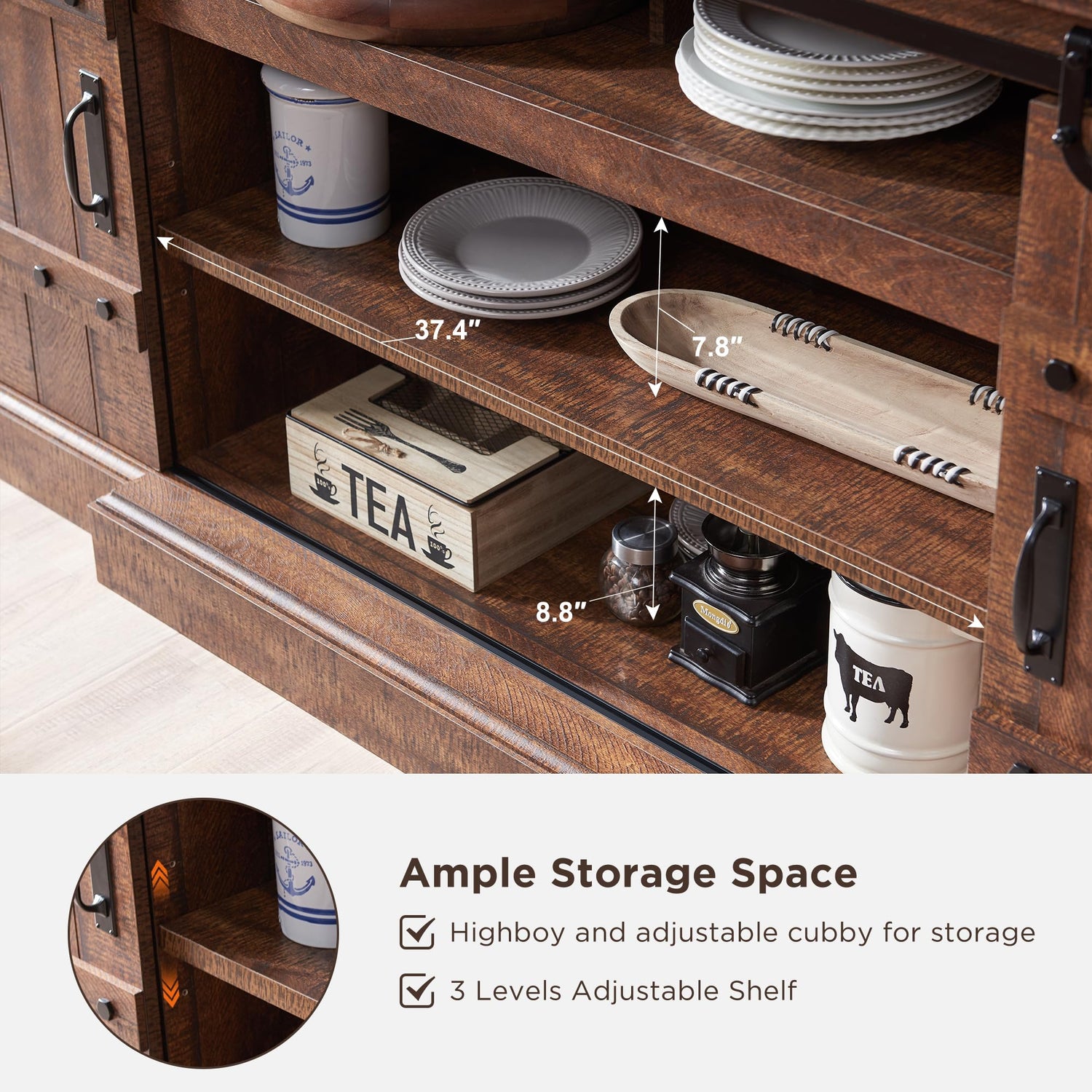 - Ample Customized Storage Space - The double-layered shelf in the middle provides a large amount of storage space, and the shelf can be adjusted to 3 heights for customized storage. While the open cubby creating additional space underneath the top for storage of tableware, kitchen utensils, or other items. Each side cabinet has one adjustable shelf to fit for items with different sizes.