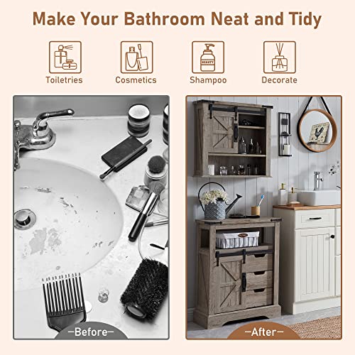 - [CUSTOMIZED STORAGE SPACE] 23.5"L × 12"W × 32"H, Utilize the tabletop to store cleaning supplies of any height, open shelf and three storage drawers for small items. Also sliding barn door and adjustable shelf to suit your storage needs, creating an orderly life space without mess not only in bathroom