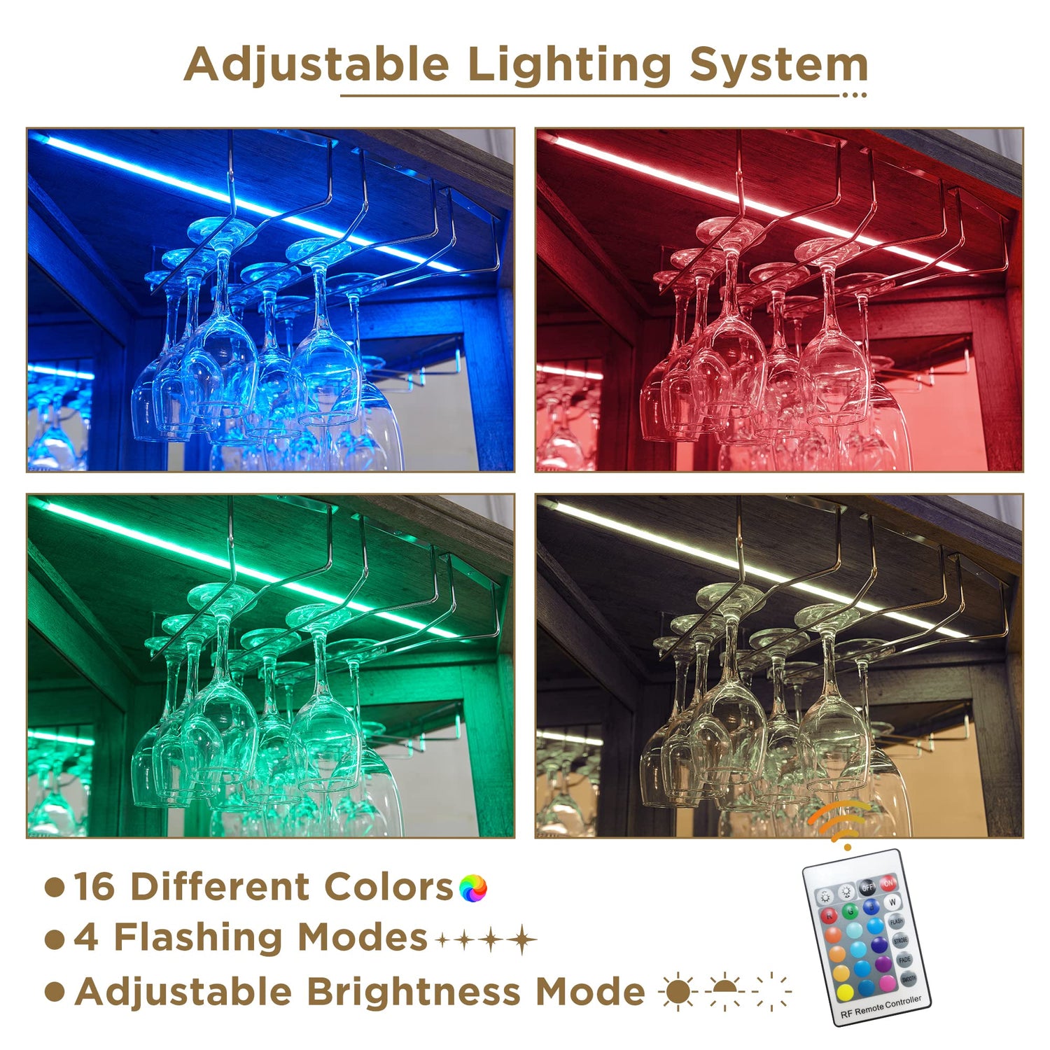- Enjoy Your Private Home Bar: Equipped with an RGB LED light strip that offers more options with 16 color, 4 flashing modes, and brightness adjustment function to make the tall bar cabinet looks so fancy and create a relaxing and cheerful ambiance in the room which is perfect for wine tasting, parties, and showcasing wine collection. With a soft glow that illuminates the stemware and wine bottles below, you can effortlessly locate and retrieve the desired bottle without fumbling in the dark