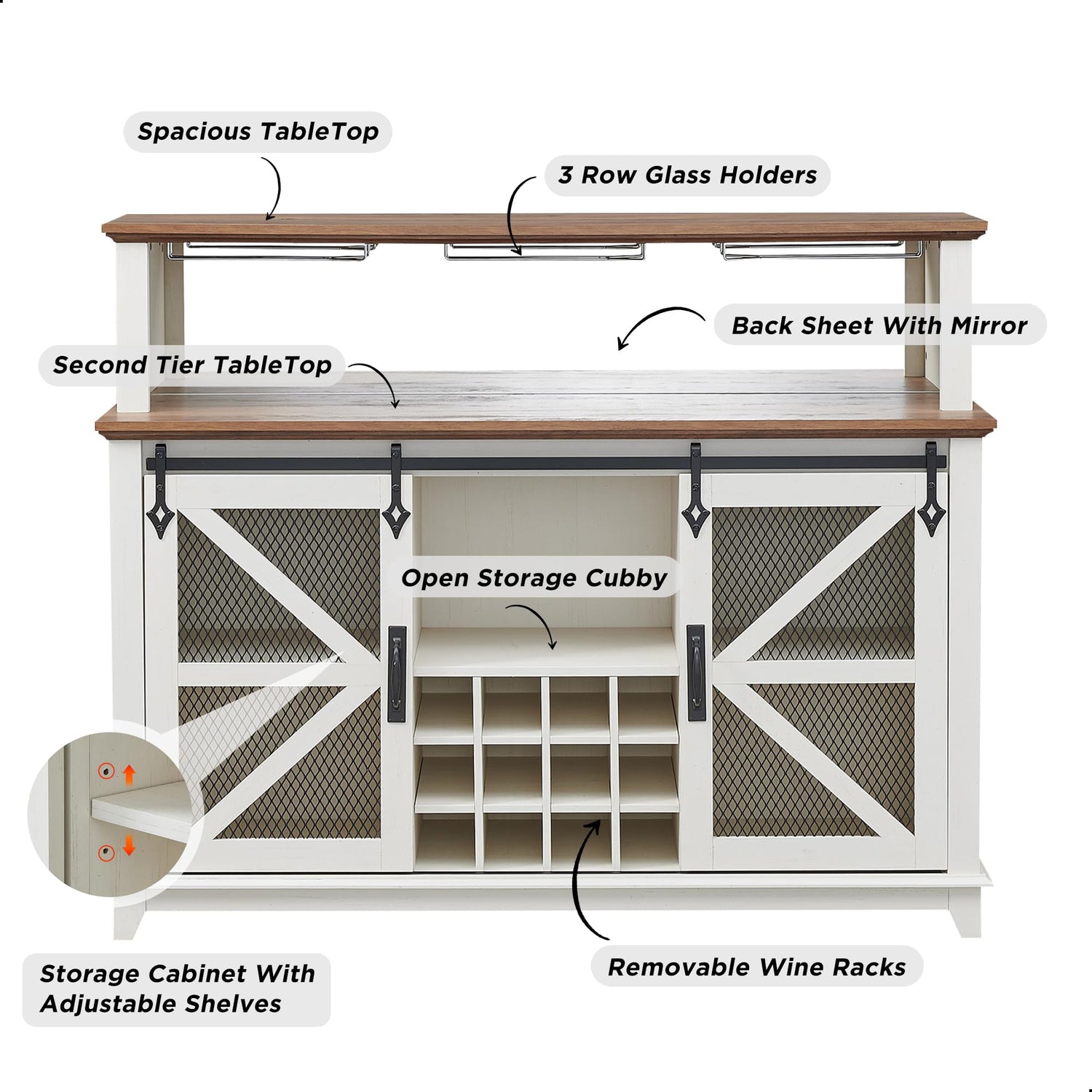 - Chic and Versatile Cabinet: The classic barn and iron mesh sliding door blends farm and industrial styles, quality sliding track ensures quiet and smooth sliding, allowing you to hide or reveal cabinet areas freely. Designed with black metal iron tone hardware, adding charm and aesthetic appeal to the cabinet. As a storage cabinet that combines beauty and functionality can be versatile as a coffee bar in the kitchen, wine cabinet in the dining room, sideboard buffet cabinet in the living room