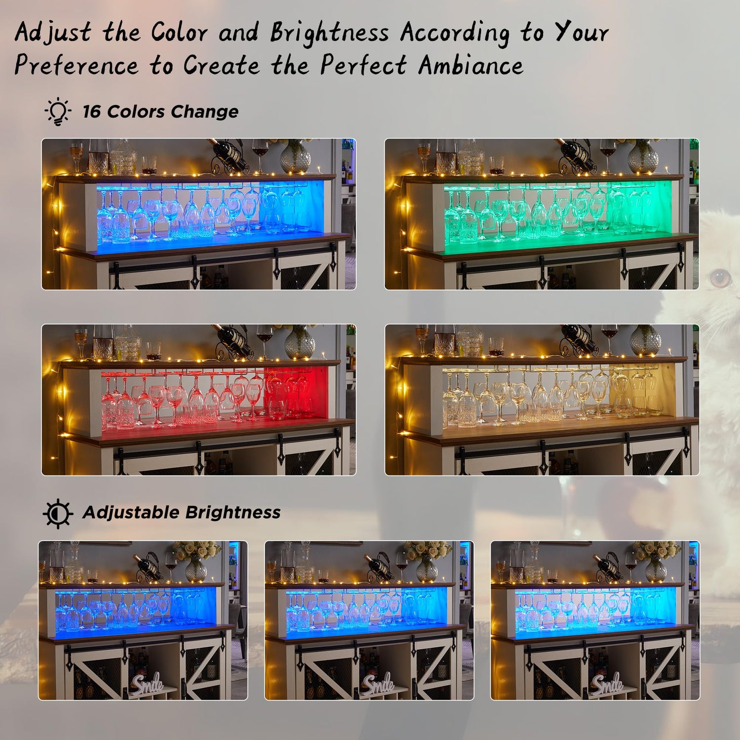 - Bar Cabinet With LED Lights: As home bar cabinet, is equipped with an RGB LED light strip with 16 colors, 4 flashing modes, and brightness adjustment function to make the wine cabinet look so fancy and create a relaxing and cheerful ambiance in the room which is perfect for wine tasting, parties, and showcasing wine collection. With a soft glow that illuminates the stemware and wine bottles below, you can effortlessly locate and retrieve the desired bottle without fumbling in the dark
