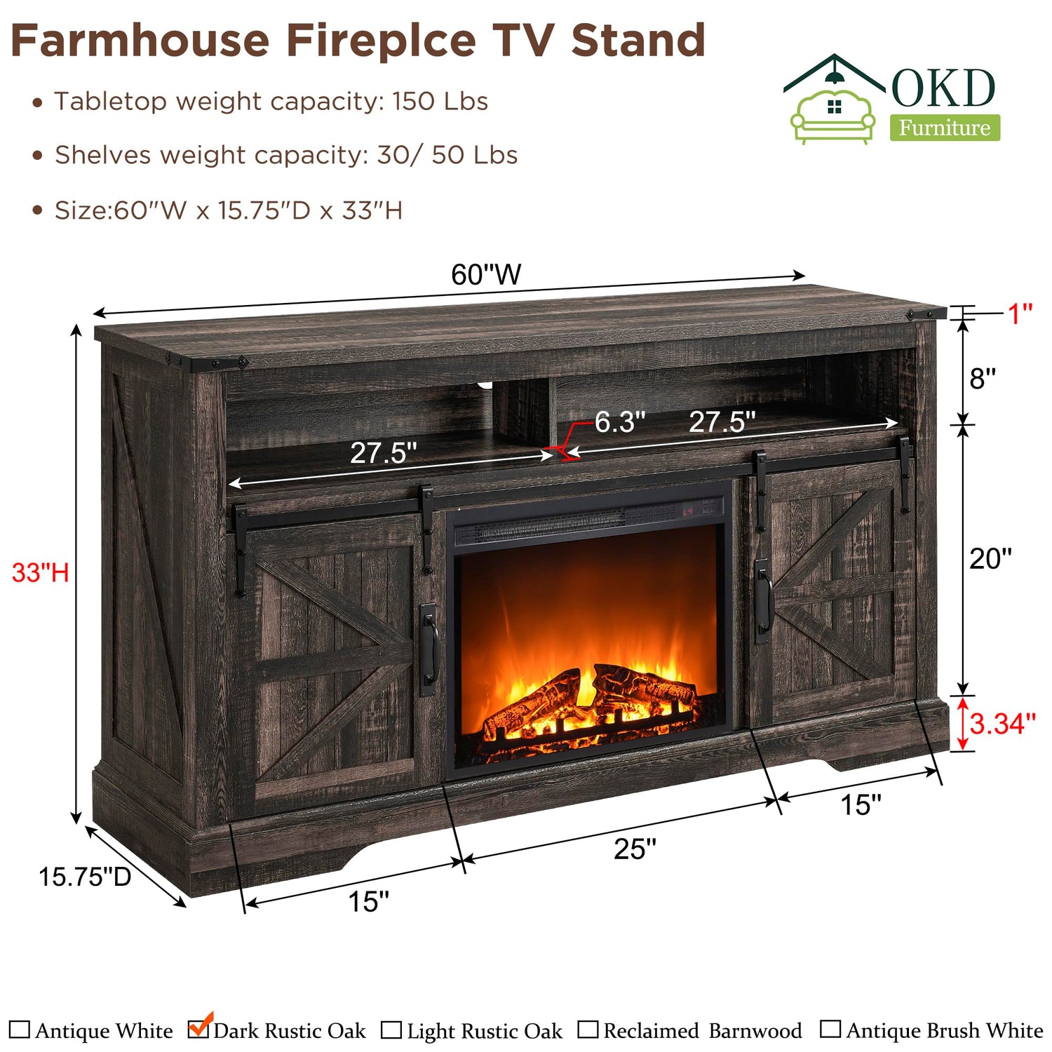 - Gorgeous and Glamorous Farmhouse Style Fireplace TV Stand: OKD Fireplace tv stand features an exquisite sliding barn door and retro metal decor. Its unique distressed finish is wonderfully eye-catching, and it has natural variations in grain, color, and texture, giving every piece a unique look, and easily creating a rustic, charming, cozy living room. Matches perfectly with other furniture in the OKD living room furniture series.