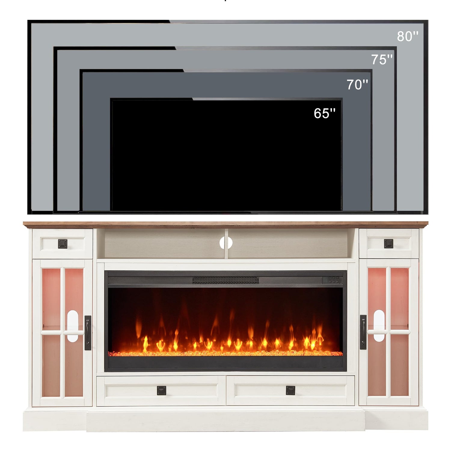 OKD Fireplace TV Stand for 80 Inch TV, Farmhouse Entertainment Center with 42" Fireplace & LED Lights, Modern Media Console Table with Storage Drawers & Cabinets for Living Room, Antique White