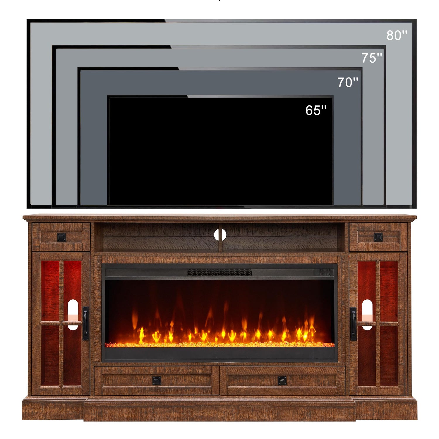 - 【Farmhouse Focal Point】The enhanced wood's rich grain gives it a naturally weathered look that accentuates its fine classic details. Chic and sophisticated, this 70" TV stand in a rustic oak finish is the perfect storage and display piece for your living room. Pair it with the 42" fireplace to create an entertainment space that is both stylish and filled with functionality