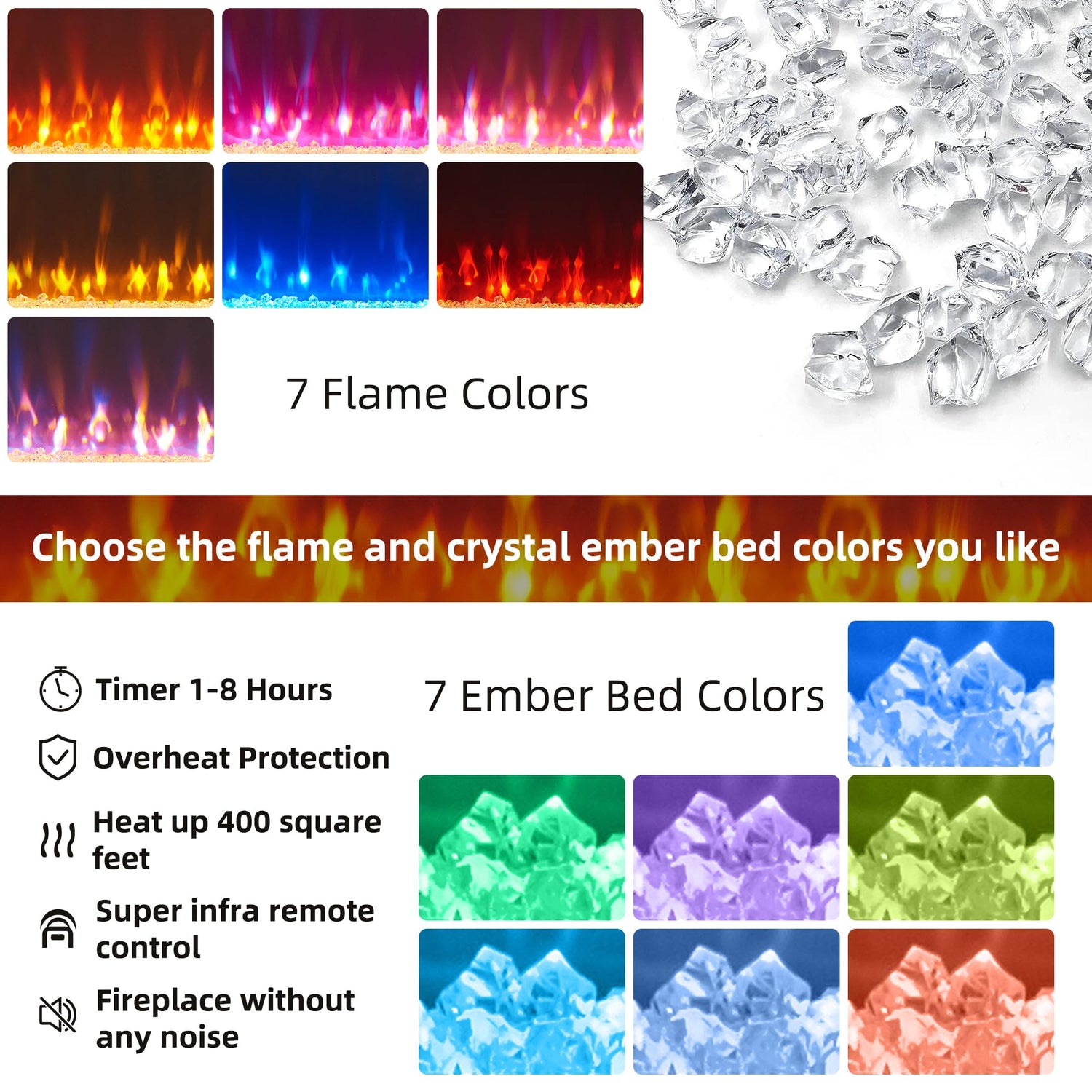- 【Better Customized Ambiance】7 adjustable flame color options, also 7 adjustable LED lighting colors on the ember bed and cabinets, providing a captivating atmosphere tailored to your mood, decor, or preference, and the shining crystal will highlight the inherent beauty of each realistic fire. Then all these functions could be finished easily by the super infra remote control
