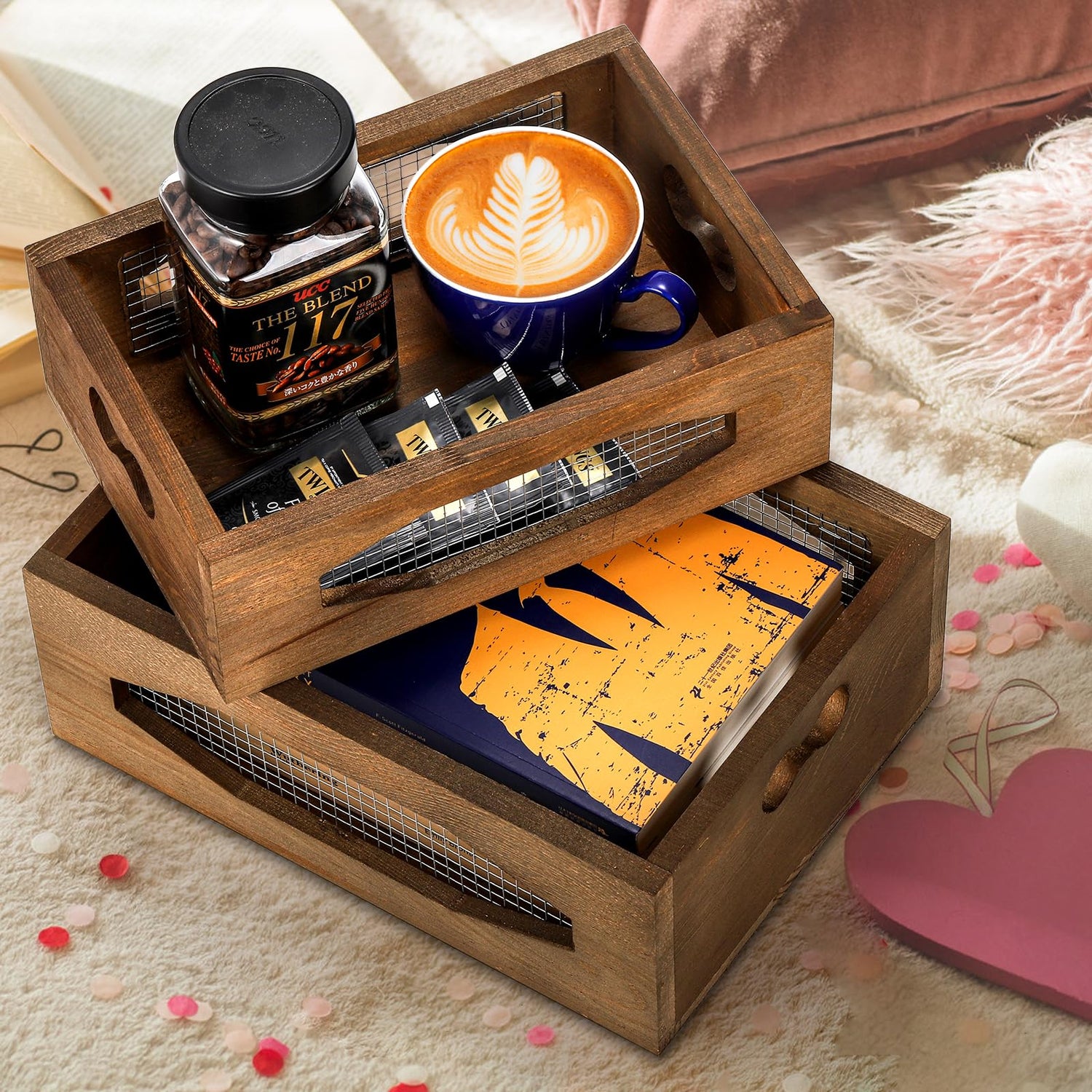 Okllen Set of 2 Wooden Nesting Countertop Baskets, Decorative Wood Storage Box Farmhouse Rustic Crate with Cutout Handles for Bread, Fruit, Vegetables, Kitchen, Bathroom, Pantry Supplies, Brown