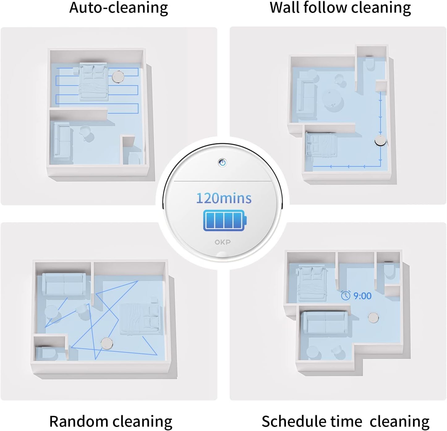 - CLEAN SMARTER - OKP Life Robotic vacuum cleaner offers multi cleaning modes: automatic, random, edge, and spot cleaning.