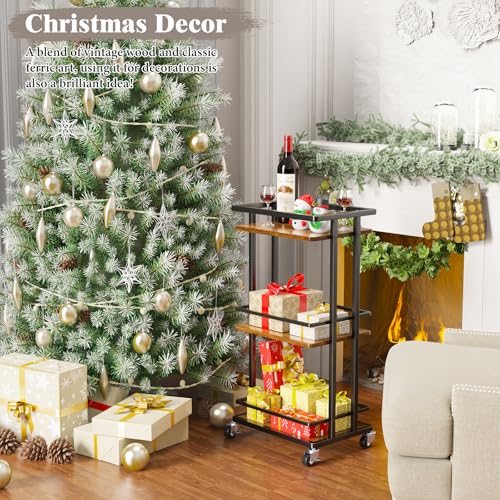 OKZEST 3 Tier Bar Cart for Home, Rolling Mini Liquor Bar for Wine Beverage Dinner Party, Utility Kitchen Storage Island Serving Cart on Wheels, Coffee Bar Cabinet for Kitchen Dining Living Room, Brown