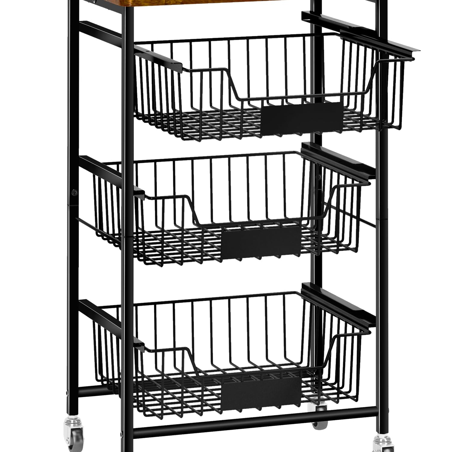 OKZEST 4-Tier Small Kitchen Storage Cart on Wheels, Metal Fruit Basket Stand with Pull-Out Baskets & Wood Top for Potato Onion Produce Snack Veggies