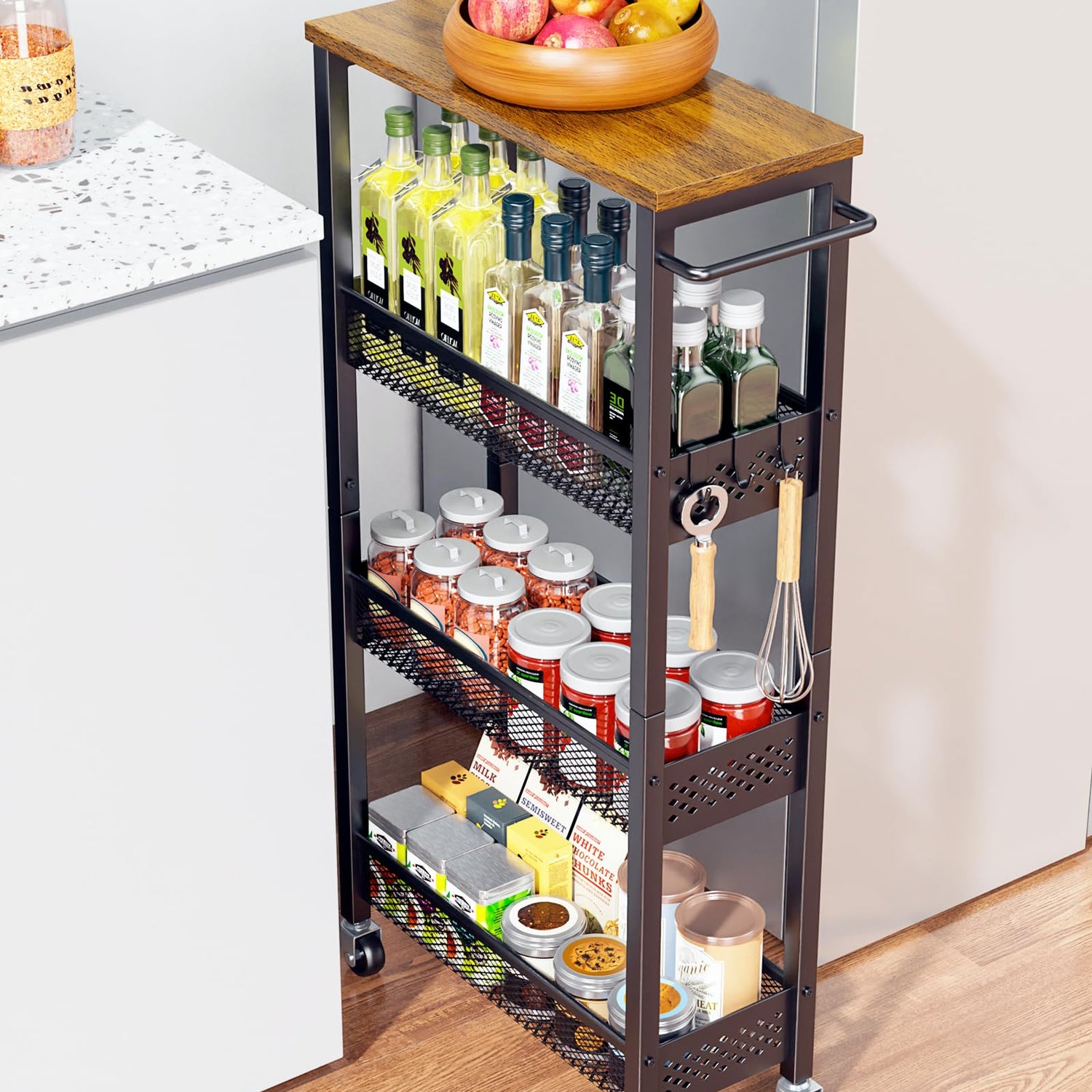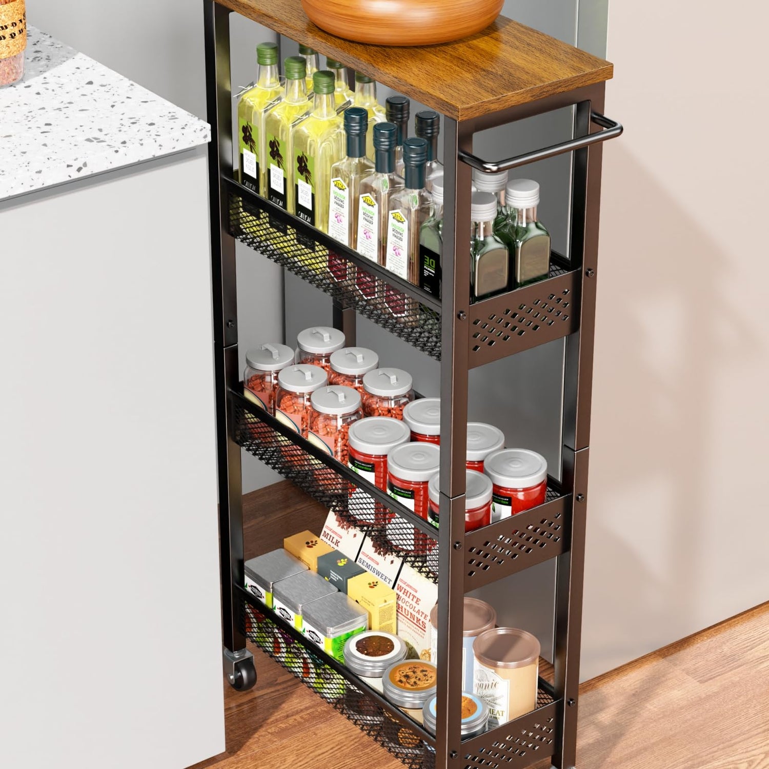- Easy to Maneuver/Assemble: Equipped with 4 high-quality castors and a handle, this slide-out narrow kitchen cart effortlessly glides in and out of small spaces. The heightened diamond guardrails are included for added safety, preventing items from falling off. Clear part numbers and easy-to-follow instructions make assembling it effortless.