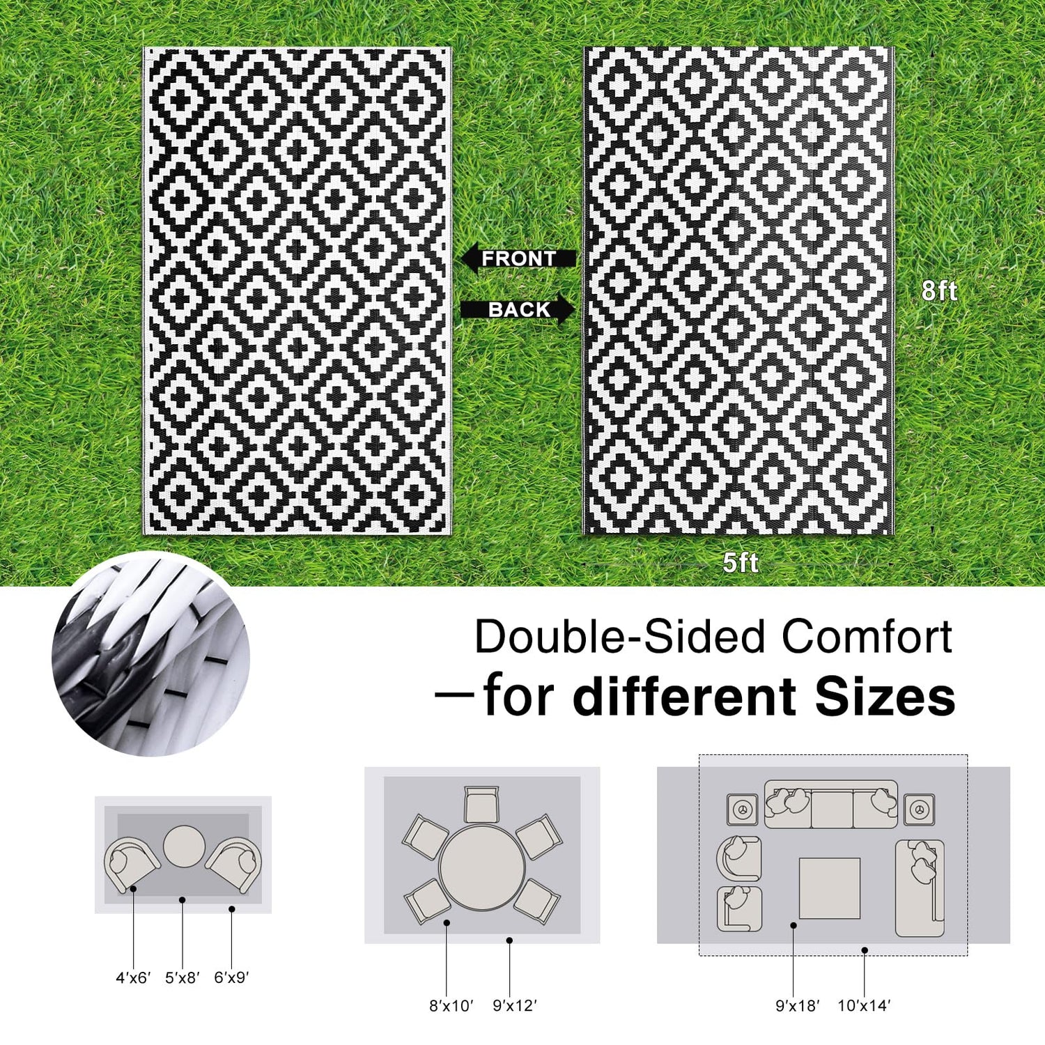 - Smooth & Gentle Underfoot: The woven plastic straw construction ensures a smooth, soft surface underfoot, making it perfect for barefoot relaxation. Whether you're lounging on the deck, sitting by the campfire, or enjoying your backyard, this outdoor area rug offers comfort and style for any occasion.
