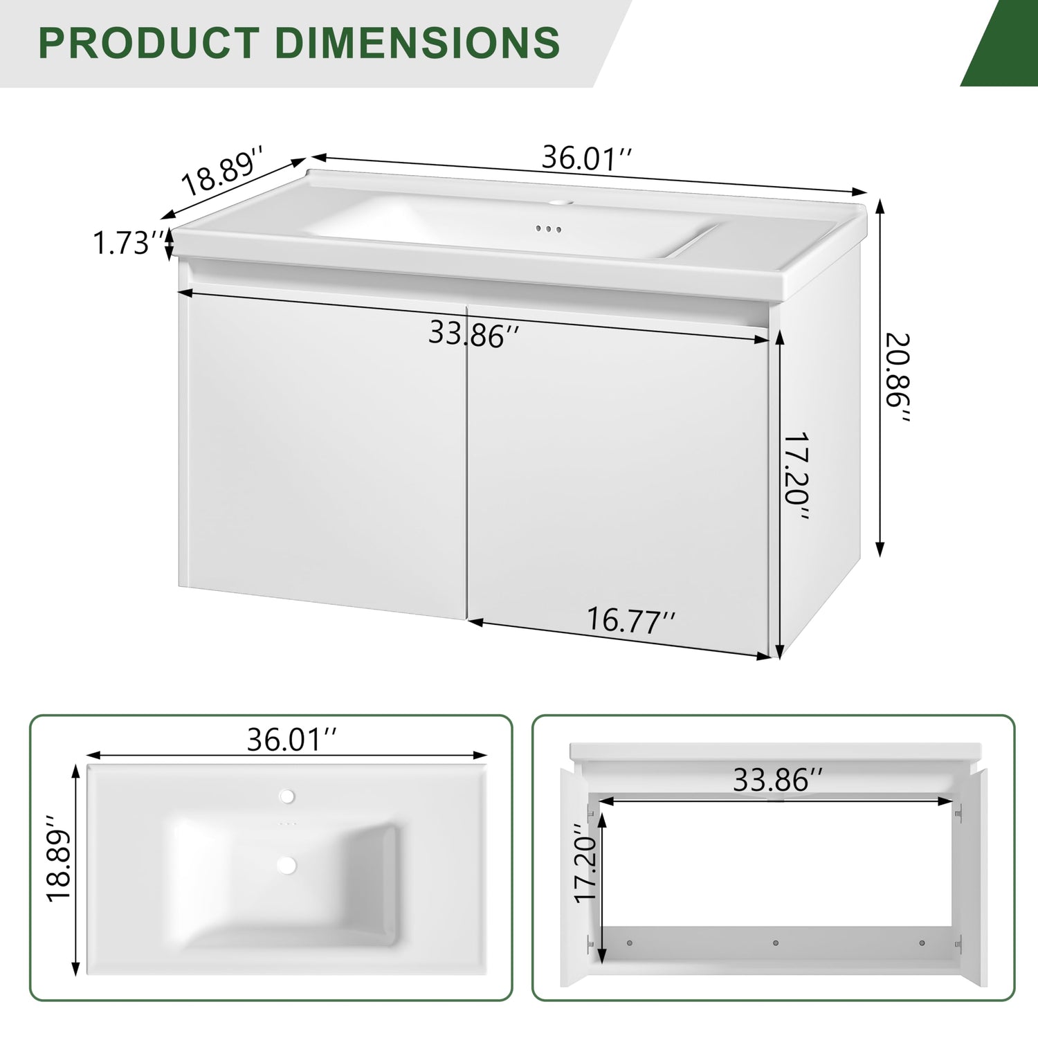 - 【Bathroom Vanity with Ceramic Sink Descriptions】Description: 36"D * 18.89"W* 20.86"L. Made from selected MDF for a sturdy and durable construction. It also comes with a ceramic sink that is easy to clean and maintain, so chores are not a problem. (Faucet and downpipe not included)