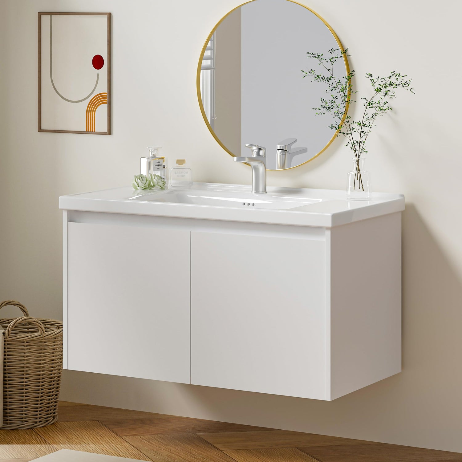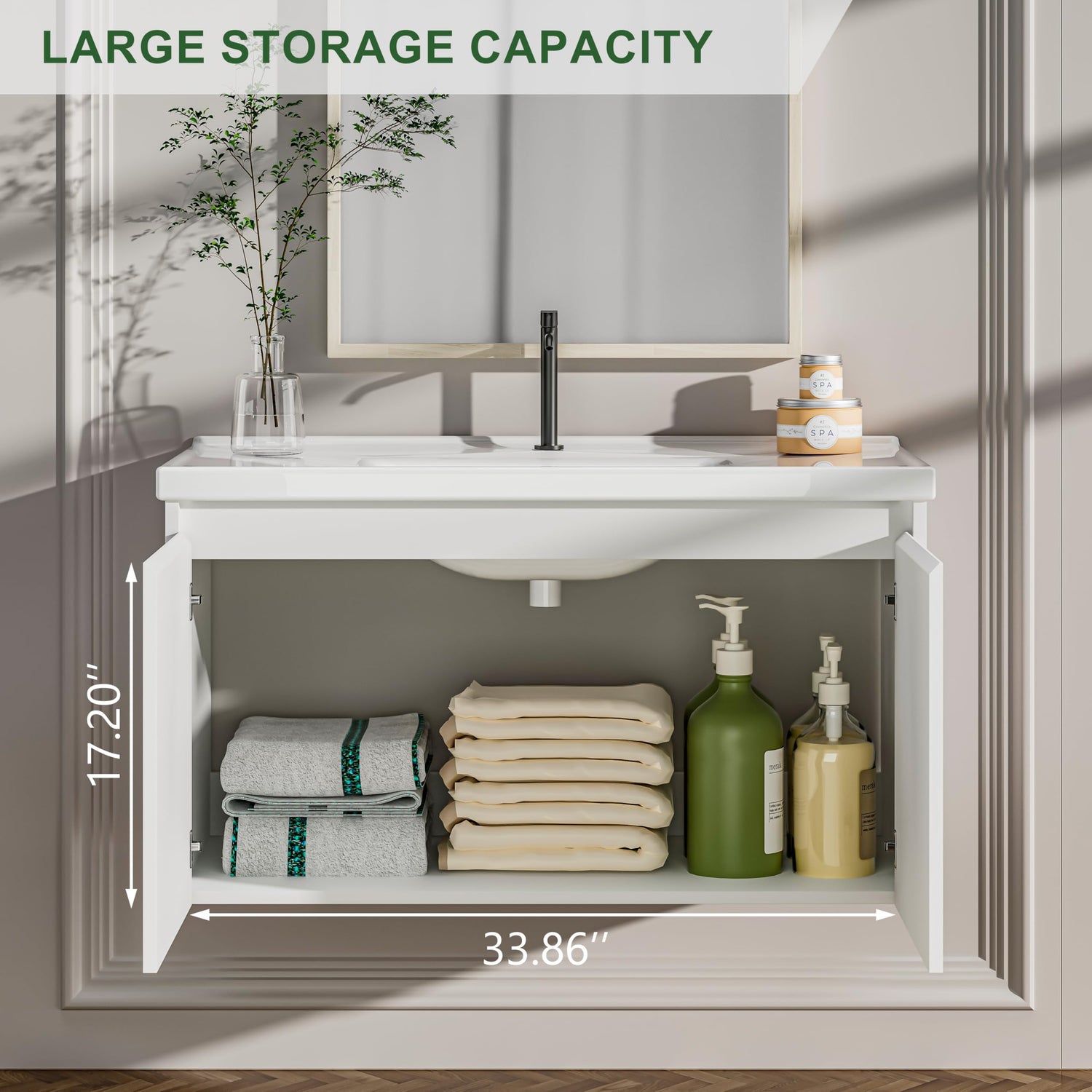 OLD CAPTAIN 36" Bathroom Vanity with Ceramic Sink, Floating Bathroom Vanity with Sink and Cabinet, Wall Mounted Bathroom Sink Cabinet with Storage and Two Doors, White