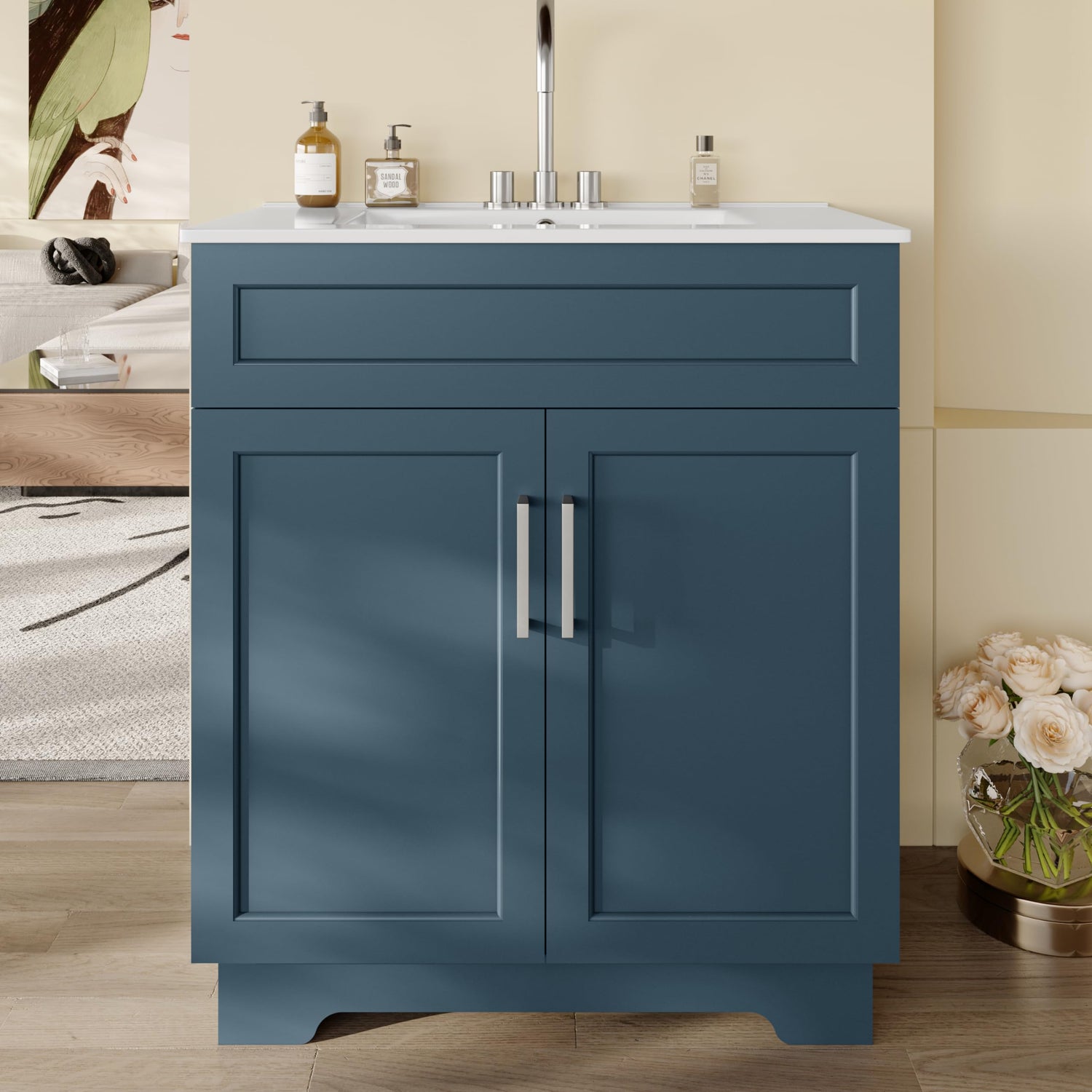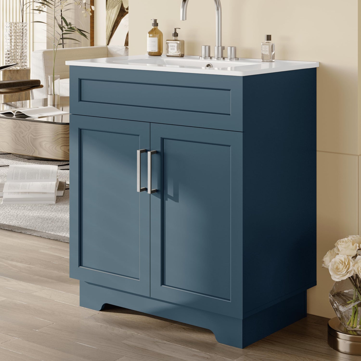 OLD CAPTAIN Bathroom Vanity with Ceramic Sink, 30" Freestanding Bathroom Cabinet Vanity with Storage, Quick Assembly Bathroom Vanity, Blue