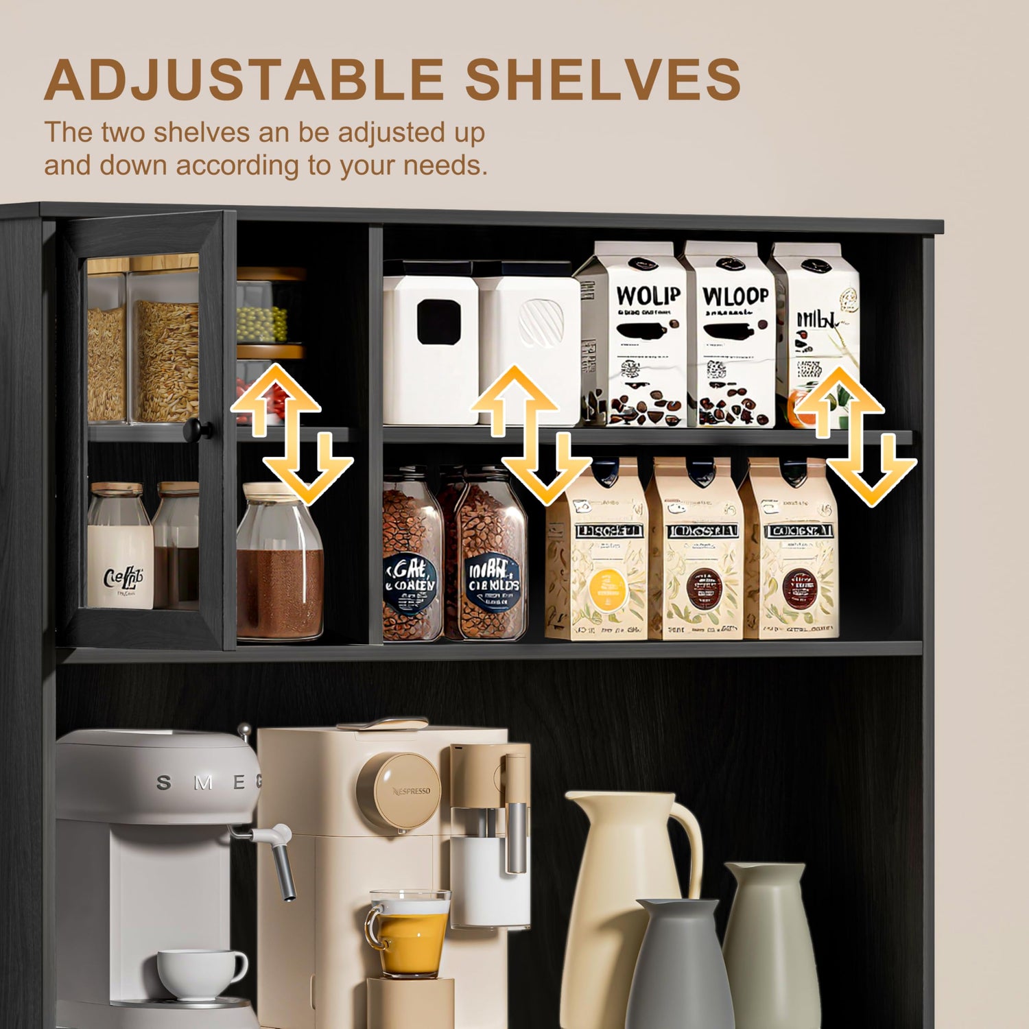 - 【Kitchen Storage Cabinet】The freestanding kitchen hutch with microwave worktop, drawers, glass cabinet door storage and open adjustable storage shelves ensures that every user has enough space to store their essentials, as well as dividers that can be adjusted to suit their needs.