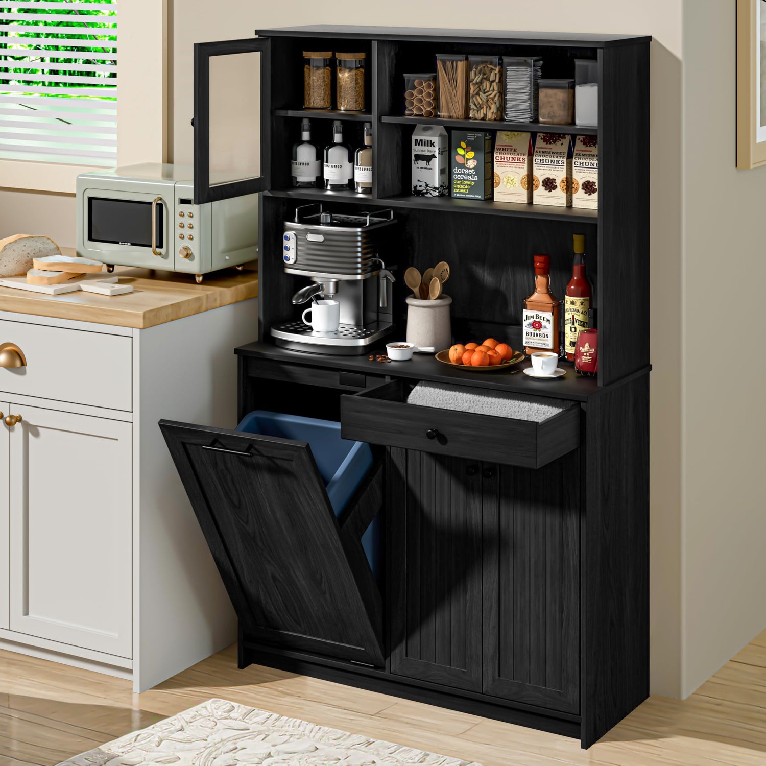 OLD CAPTAIN Tilt Out Trash Cabinet with Deodorising Function, Kitchen Hutch with Microwave Shelf and Drawer, Kitchen Pantry with Trash Cabinet for 10 Gallons, Black