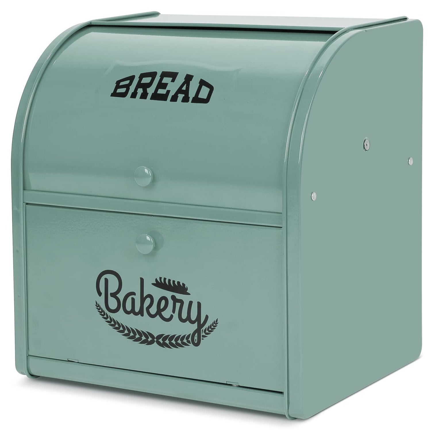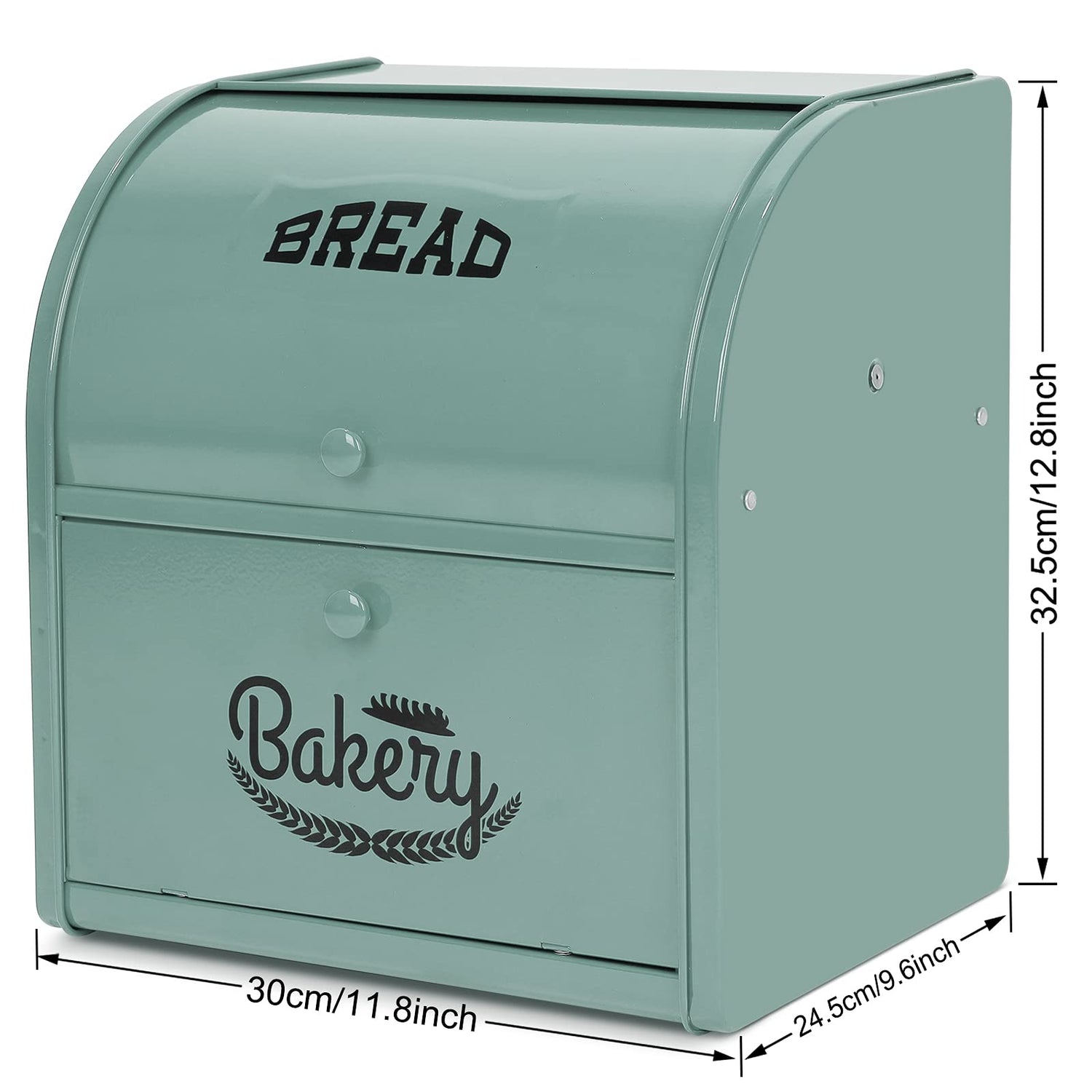 ★The breadbox is made of high-quality steel to provide high durability. It is also very easy to maintain, just use a wet cloth to wipe to keep the appearance stylish.★This bread holder for kitchen counter can reduce the burden on any kitchen and make your cabinets no longer messy, which is necessary for any home or bakery.★Large capacity provides enough space to fit a wide range of different sized delicious baked goods, as a very useful storage unit for your bread, muffins and pastries.★Store bread and pastries in a cool bread boxes, and retains just enough air and moisture to keep the bread fresh.★The tiered design can accommodate moderately sized breads, with extra space to keep your hamburgers, french fries, bagels, or hot dogs ... all be placed neatly and orderly.★The double-layer large bread box has a classic appearance and will make all your friends envy with its unique farmhouse retro style and rustic kitchen style.★This breadbox for kitchen countertop is also an ideal gift for any kitchen lover in housewarming or birthday, mother's day, wedding, bridal shower, anniversary.Specification:Material: MetalSize: 11.8 x 9.6 x 12.8inchesOccasion:home/kitchen/party/bakery/Cafe/restaurantPackage:1 x Bread BoxNo matter what your kitchen style is, Its stylish design and elegant colors can complement the beauty of any kitchen or countertop. Let your kitchen no longer be chaotic and life no longer monotonous. Start with the first bread box!