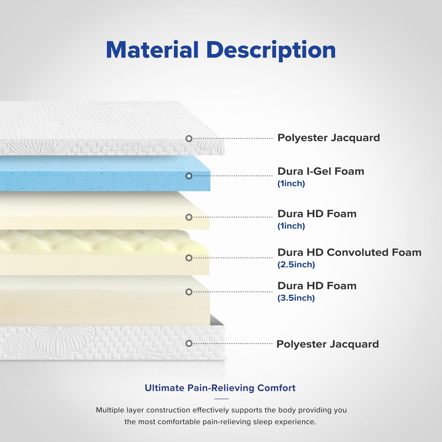 - [ 4 Layers ] - 1" Cooling Gel Memory Foam + 1" High Density Foam + 2.5" Convoluted High Density Foam + 3.5" High Density Foam