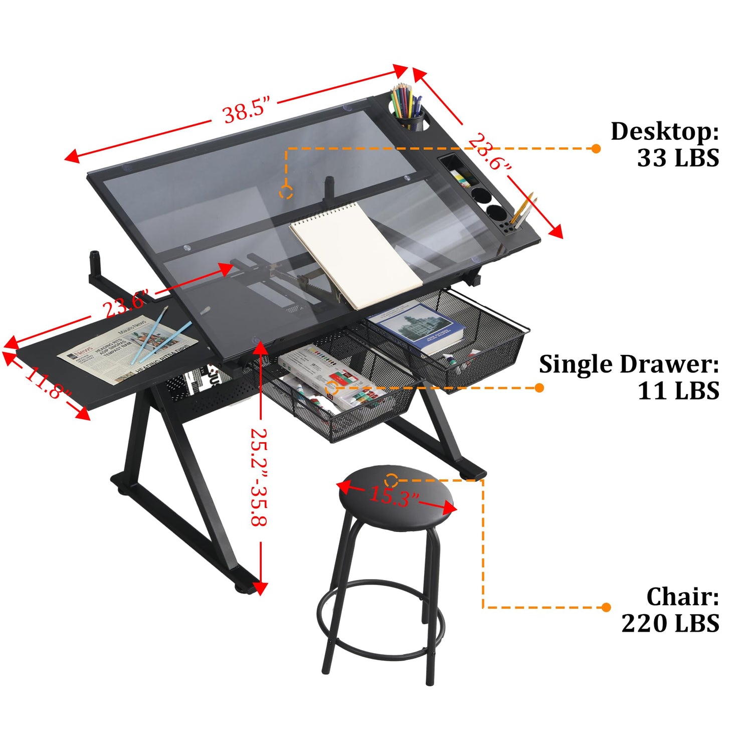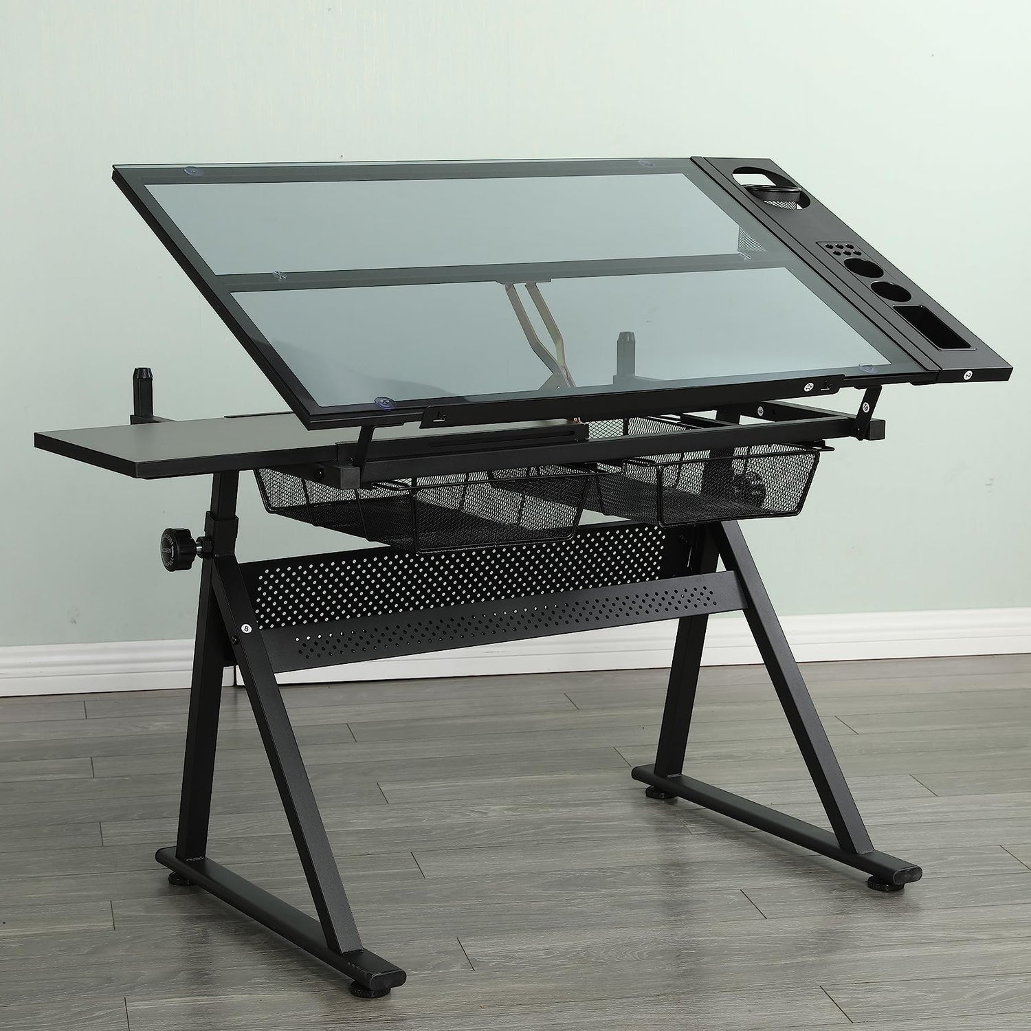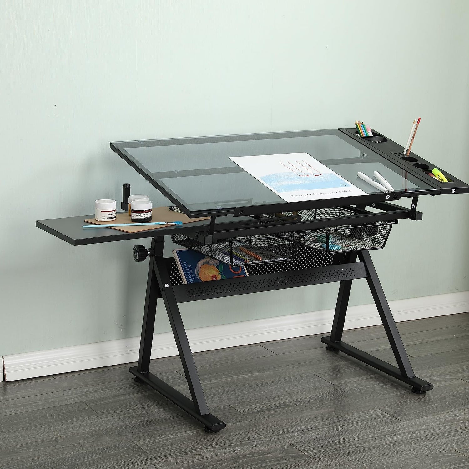 - Large Storage Space: This glass drafting table has many compartments, trays, and hanging drawers on the bottom to hold all your paints, pens, and other equipment, ensuring that every drafting tool is within easy reach.